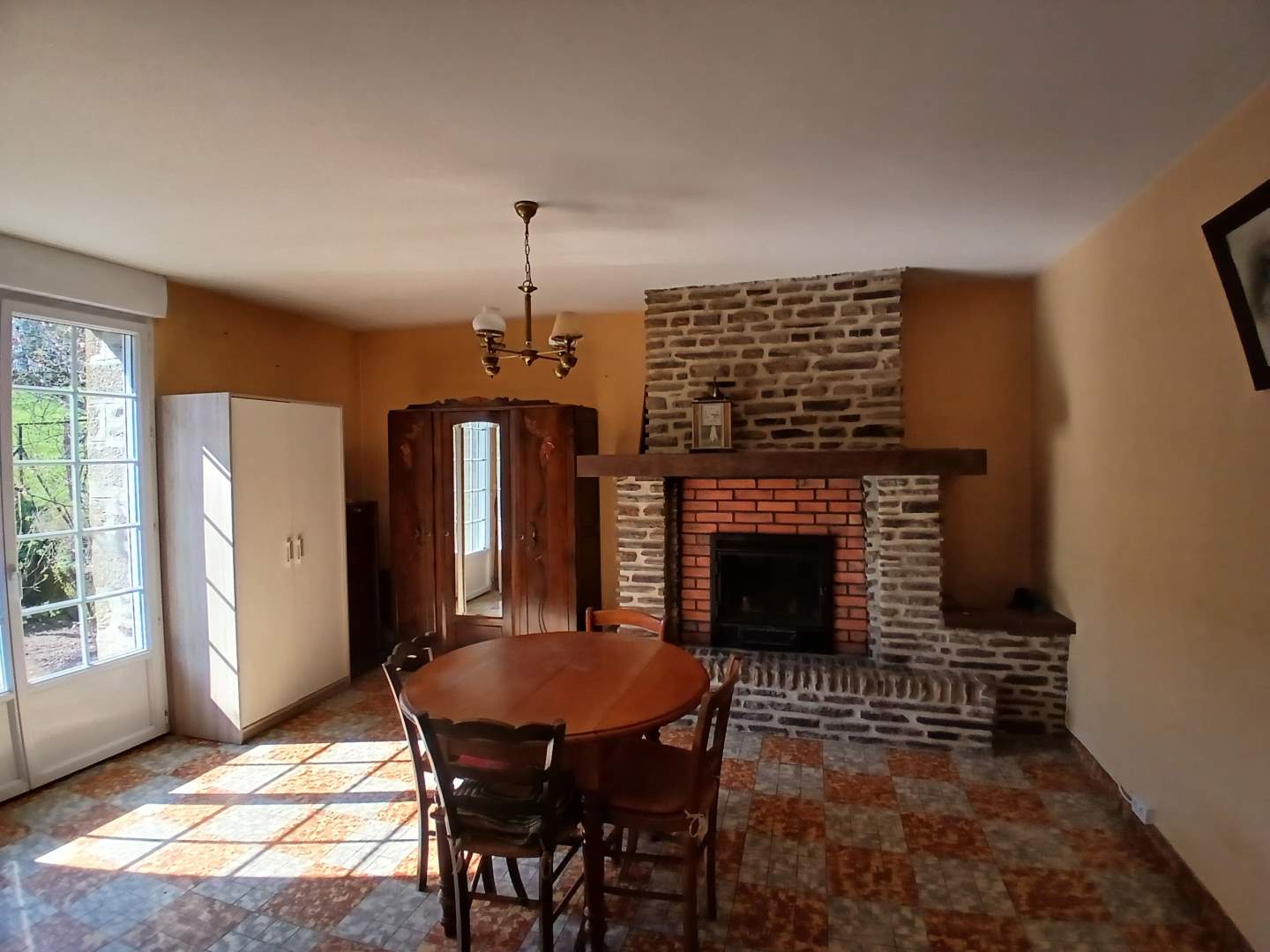 En rez de chaussée : entrée, dégagement, cuisine, salle à manger avec cheminée et insert, salle d’eau, wc, chaufferie, appentis.