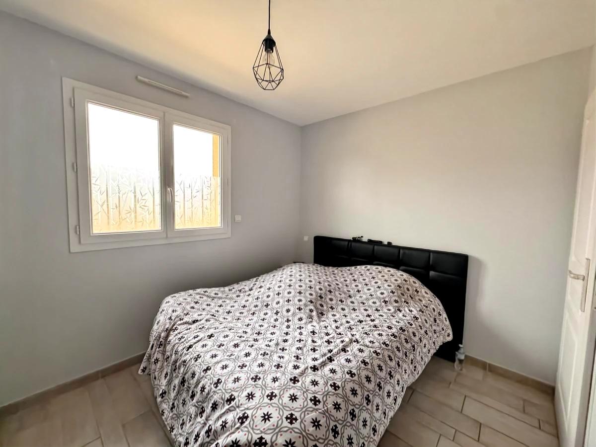 Elle se compose d'une entrée menant à une chambre avec une salle d'eau privative, wc séparé, puis d'une pièce de vie comprenant un salon-séjour avec poêle à granulés, ouvert sur une cuisine aménagée et équipée avec un accès direct à la terrasse, ainsi qu'un cellier.