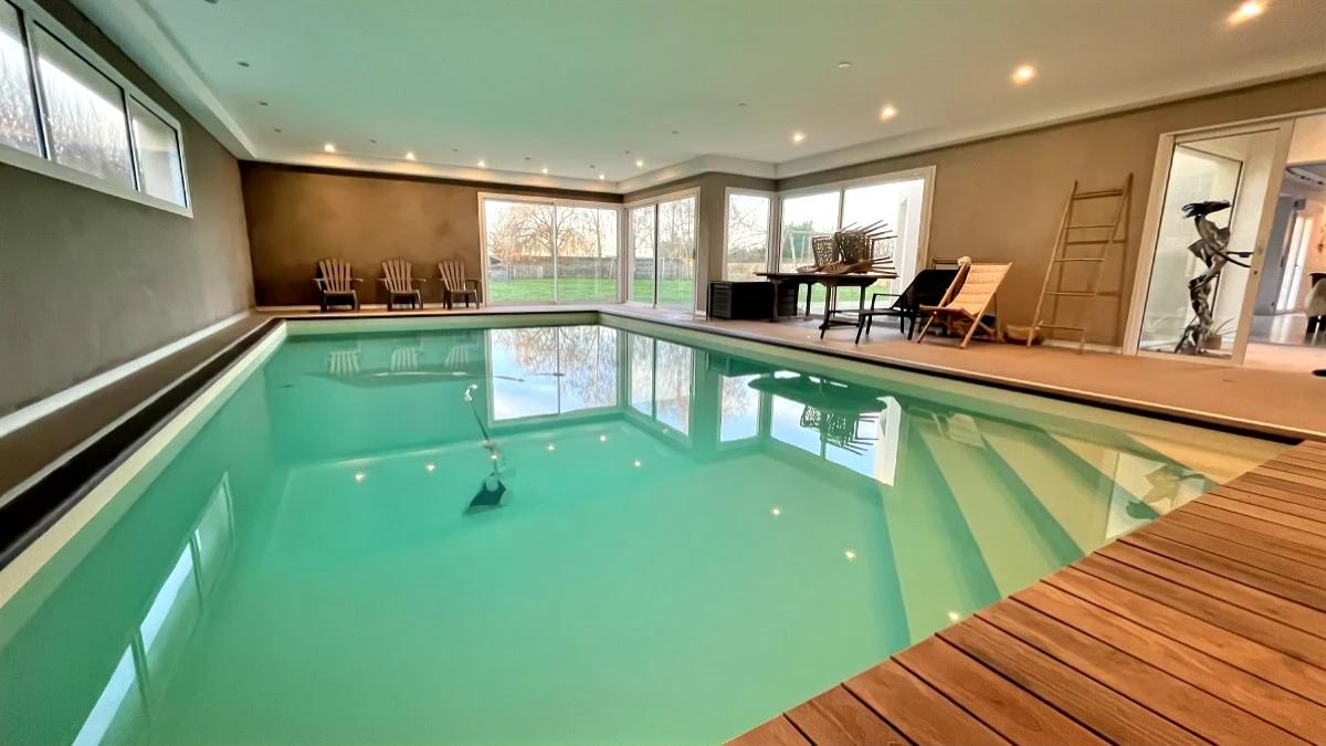 - Au RDC : vous trouverez une vaste entrée, un salon/séjour lumineux et convivial, une cuisine aménagée et entièrement équipée récente, une arrière-cuisine, une chambre avec salle d’eau, un wc, une magnifique piscine couverte avec son pool house,