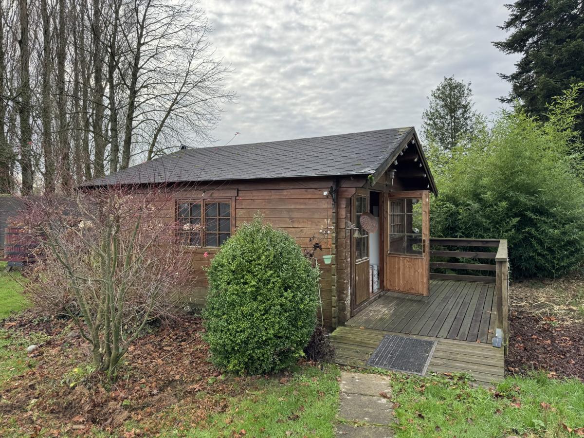 BEAUFOUR-DRUVAL Au calme Maison de 59m² comprenant: Pièce de vie avec cuisine ouverte, véranda, chambre avec salle d'eau et wc. A l'étage: mezzanine à usage de chambre Terrain de 2.000m² avec chalet
