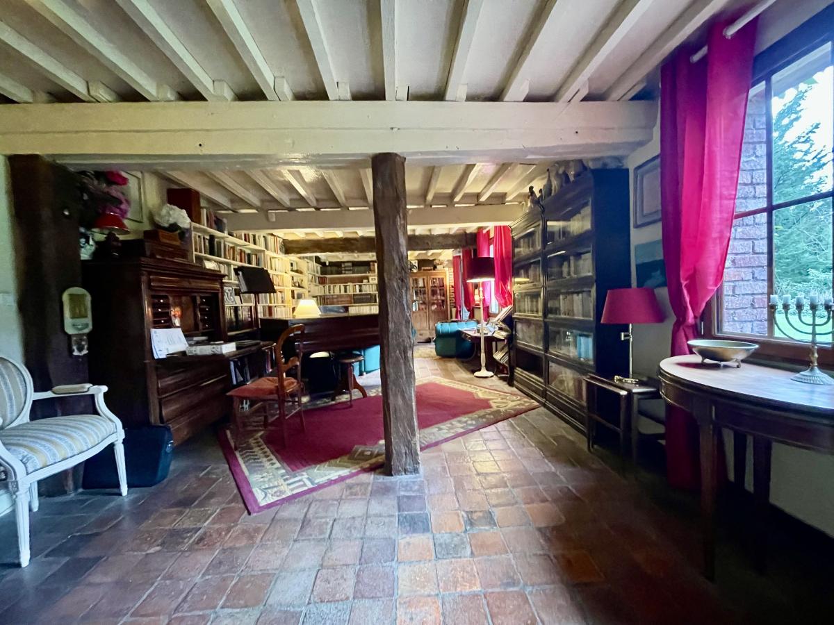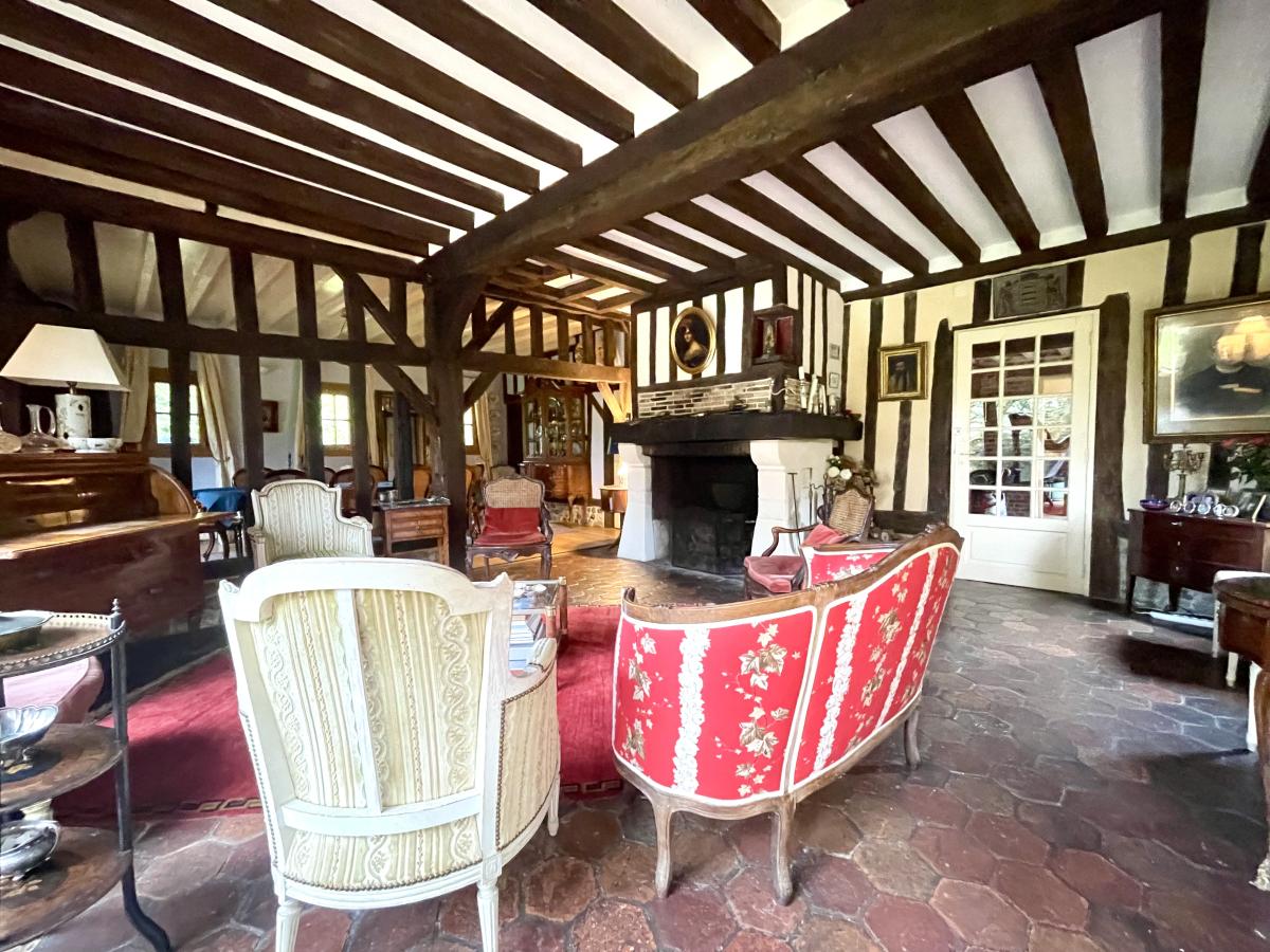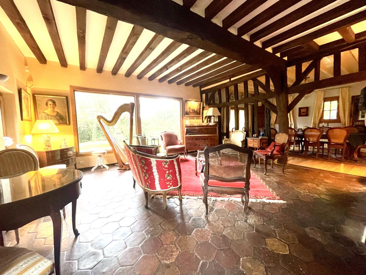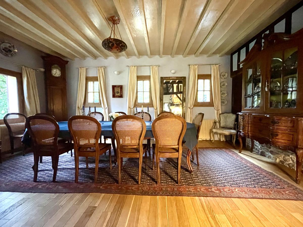 Maison en colombages couverte en ardoises de 1880 comprenant Au rez-de-chaussée : une entrée desservant un très beau séjour avec cheminée de 53 m² , un salon bibliothèque de 36 m² , cuisine aménagée et équipée , couloir desservant une salle de bains , wc , une chambre avec dressing , wc séparé , chaufferie , un bureau et une autre chambre. A l'étage un grand couloir dessert une suite parentale avec cabinet de toilette et cinq autres chambres , une salle de bains et wc . Dépendance à usage de garage Le tout sur un joli parc de 6.235 m² .