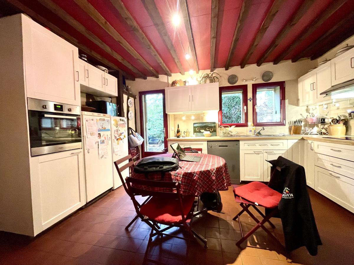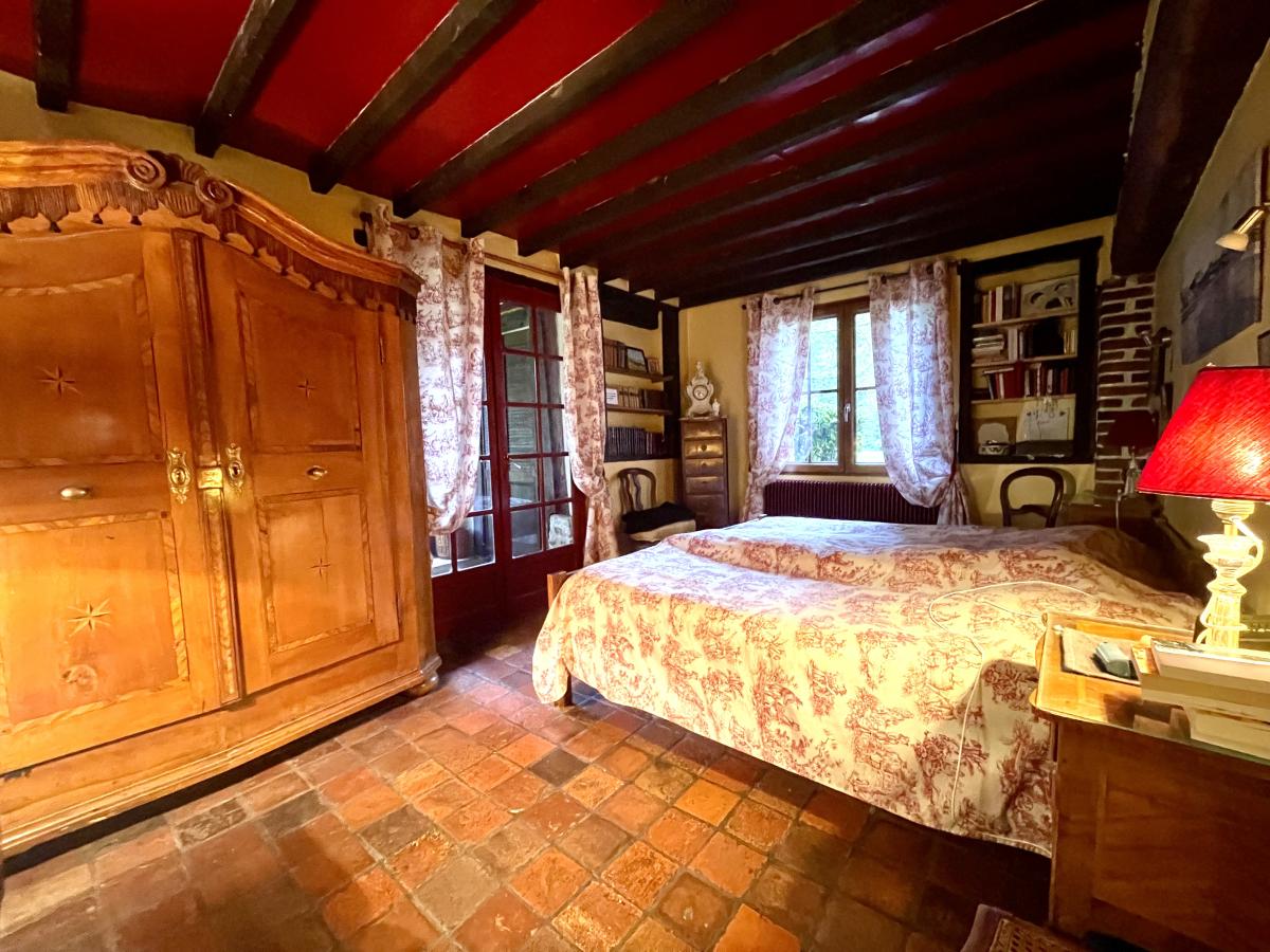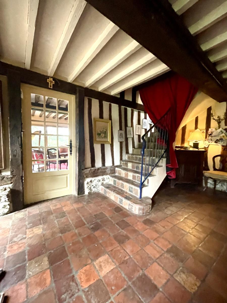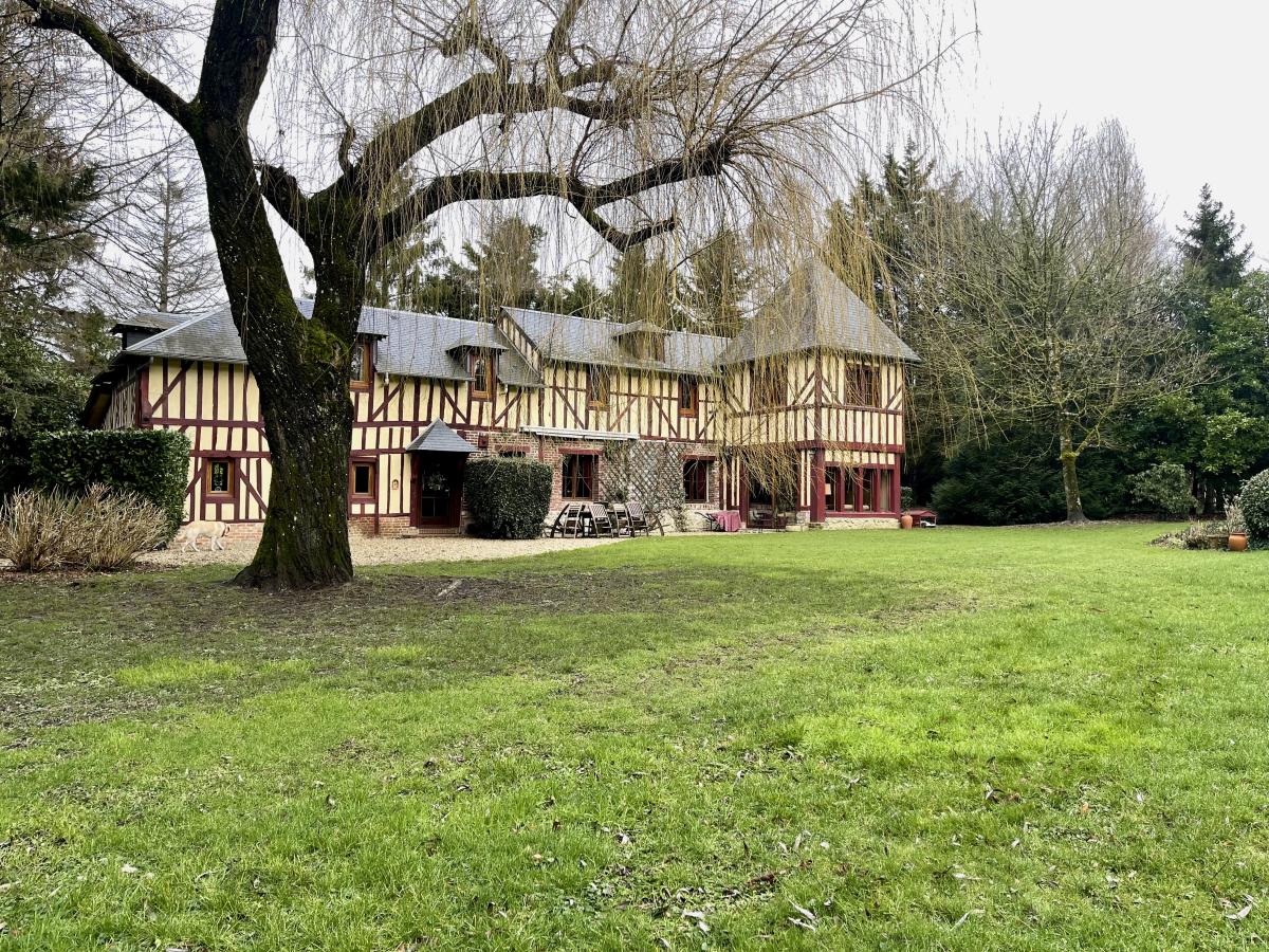 Maison en colombages couverte en ardoises de 1880 comprenant Au rez-de-chaussée : une entrée desservant un très beau séjour avec cheminée de 53 m² , un salon bibliothèque de 36 m² , cuisine aménagée et équipée , couloir desservant une salle de bains , wc , une chambre avec dressing , wc séparé , chaufferie , un bureau et une autre chambre. A l'étage un grand couloir dessert une suite parentale avec cabinet de toilette et cinq autres chambres , une salle de bains et wc . Dépendance à usage de garage Le tout sur un joli parc de 6.235 m² .