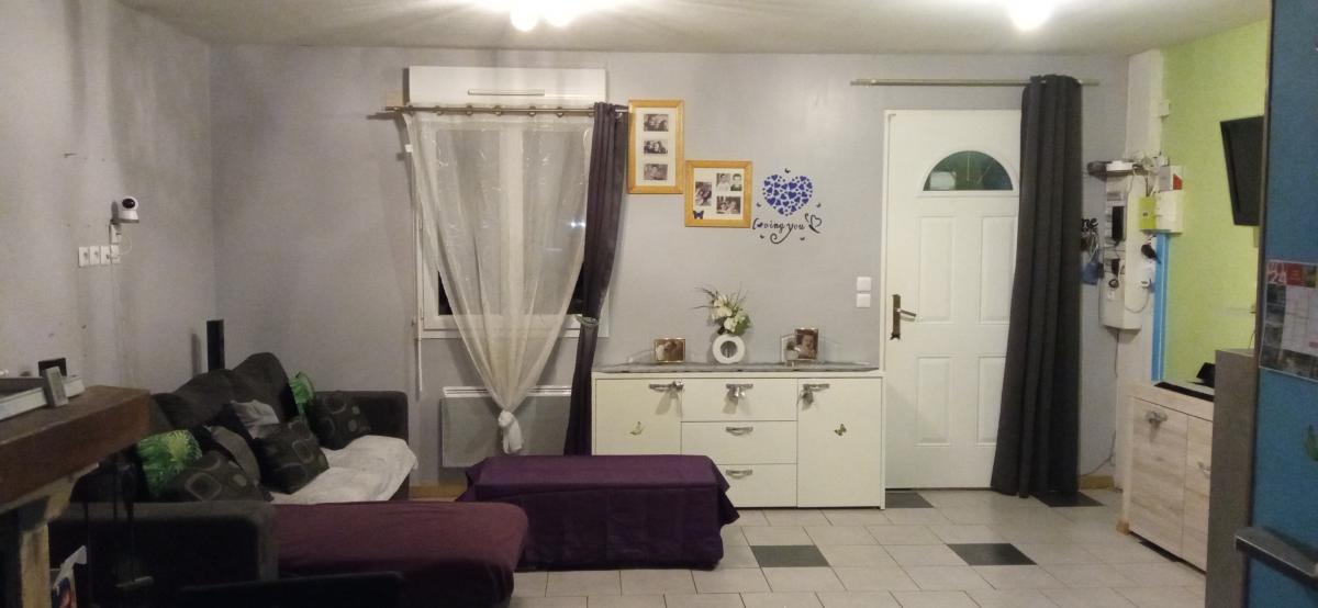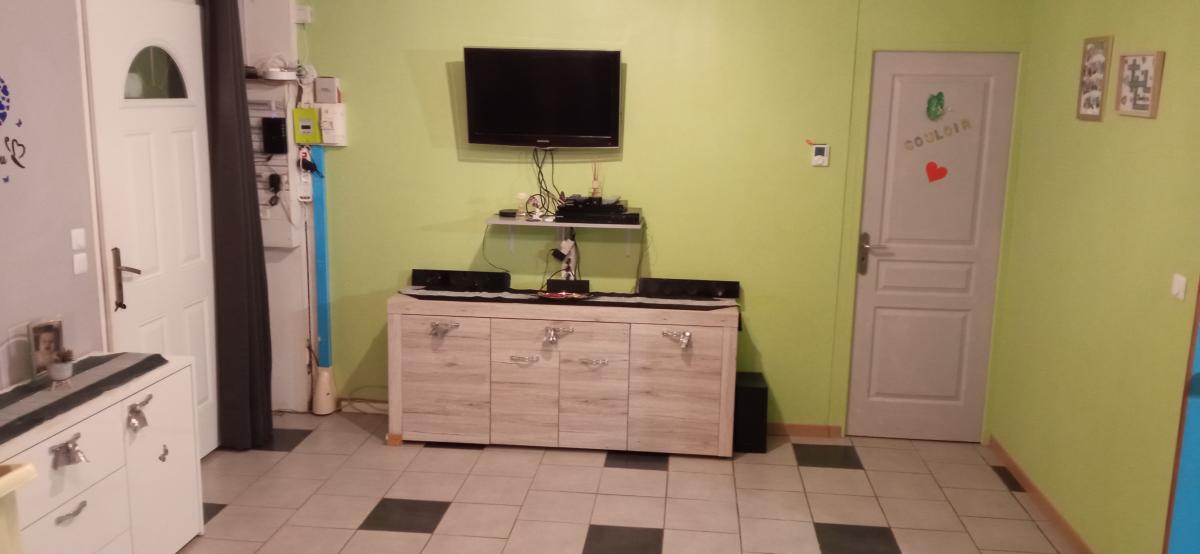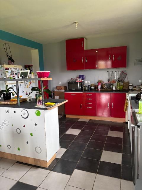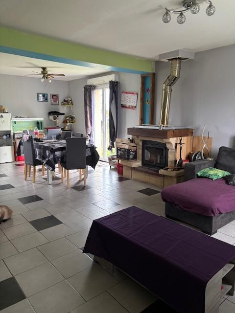 - au rez-de-chaussée : une cuisine ouverte sur un grand séjour avec poêle à bois, un dégagement avec placard, 3 chambres, une salle d'eau, et WC, grenier aménageable au-dessus.