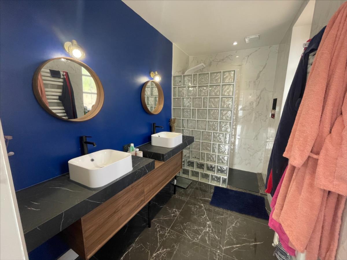 et 2 lavabos,- Au sous-sol : cave, chaufferie, buanderie, garage.Le tout sur un terrain de 902 m² avec abri de