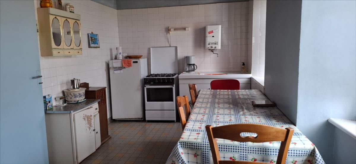 au rez-de-chaussée : séjour avec poêle à fioul, cuisine, dégagement - couloir, WC,