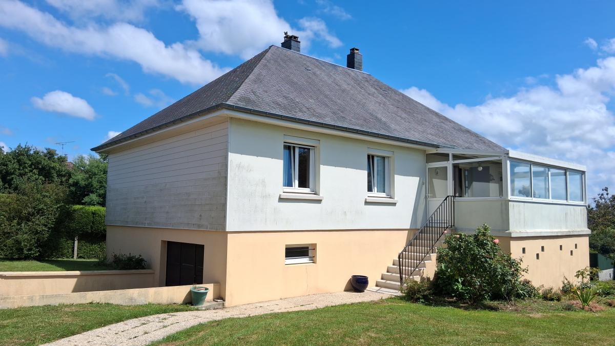 EN EXCLUSIVITE ! A proximité de la gare, et des lycées, dans un quartier tranquille : Un pavillon sur sous-sol en bon état, avec une belle vue sur la campagne : Au rez-de-chaussée surélevé : entrée dans véranda, orientée Sud/Ouest, un séjour/salon avec cheminée, une cuisine aménagée et équipée, wc, une salle de bains, trois chambres. Grenier isolé. Un sous-sol complet: garage, wc avec lave-mains, arrière-cuisine, chaufferie. Jardin autour.