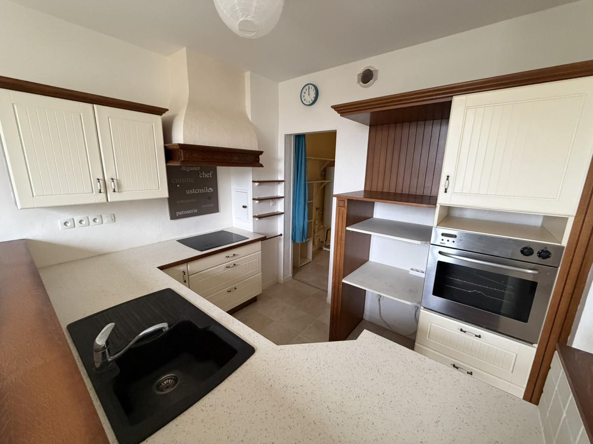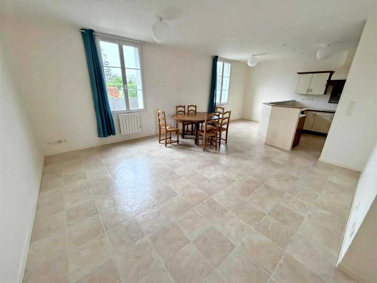 Barneville, en centre bourg, appartement en rez de chaussée comprenant : grand séjour avec cuisine ouverte équipée, arrière-cuisine/buanderie avec placard, deux chambres dont une avec placard, salle de bains, WC avec lave-mains.