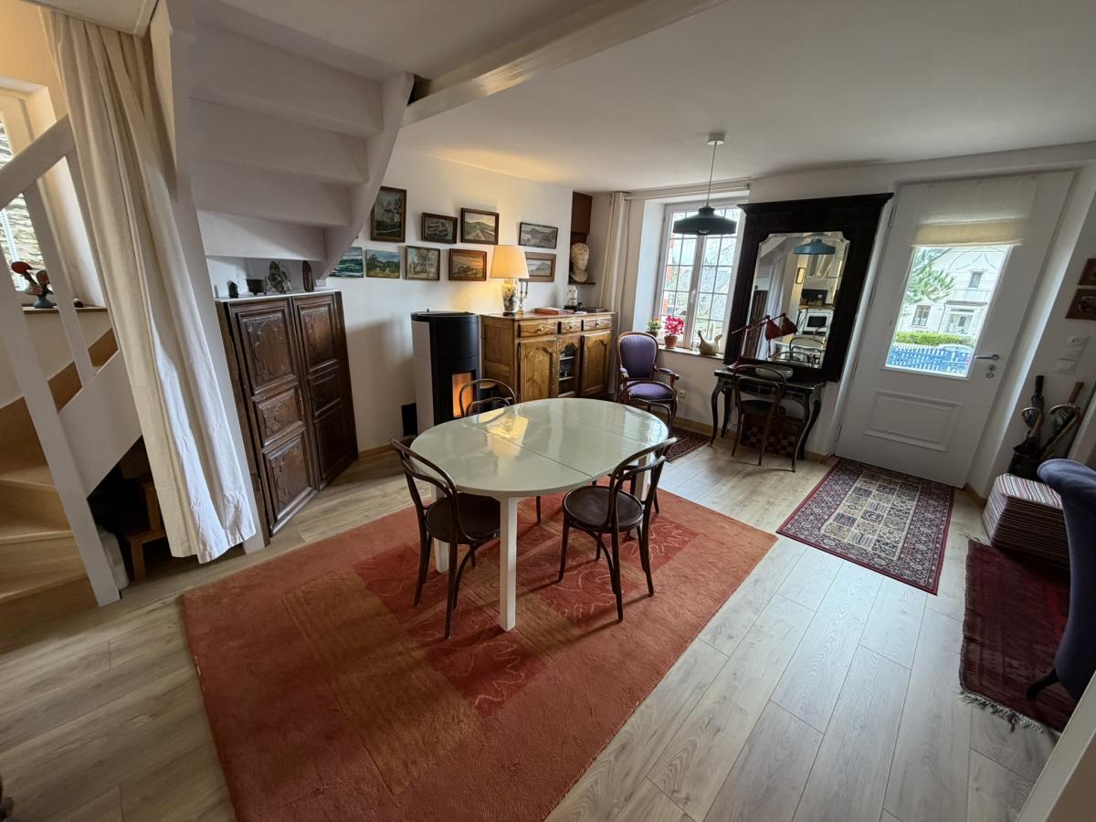 - Au rez de chaussée: séjour avec cheminée, placards et poêle à granulés, cuisine équipée, salle d'eau avec WC et douche à l'italienne, une grande chambre.