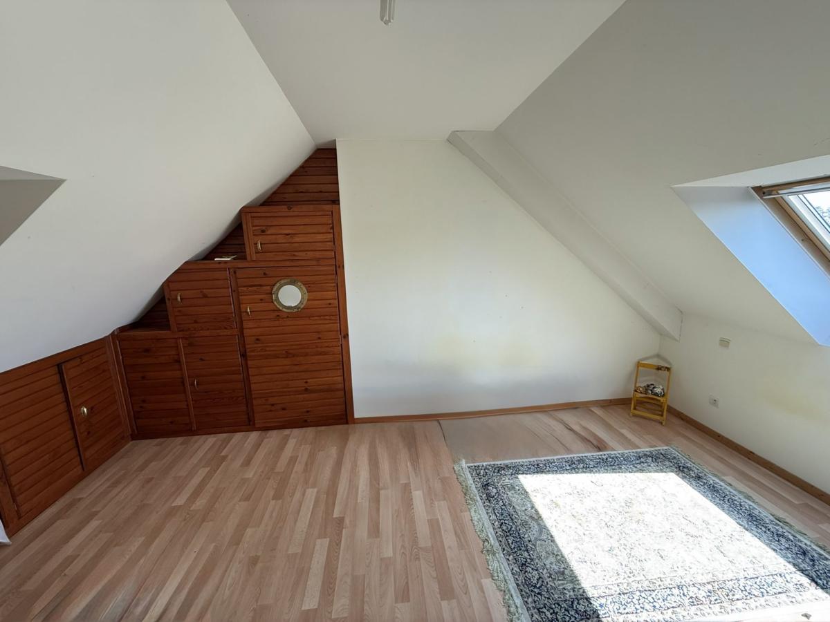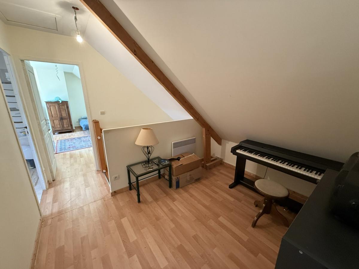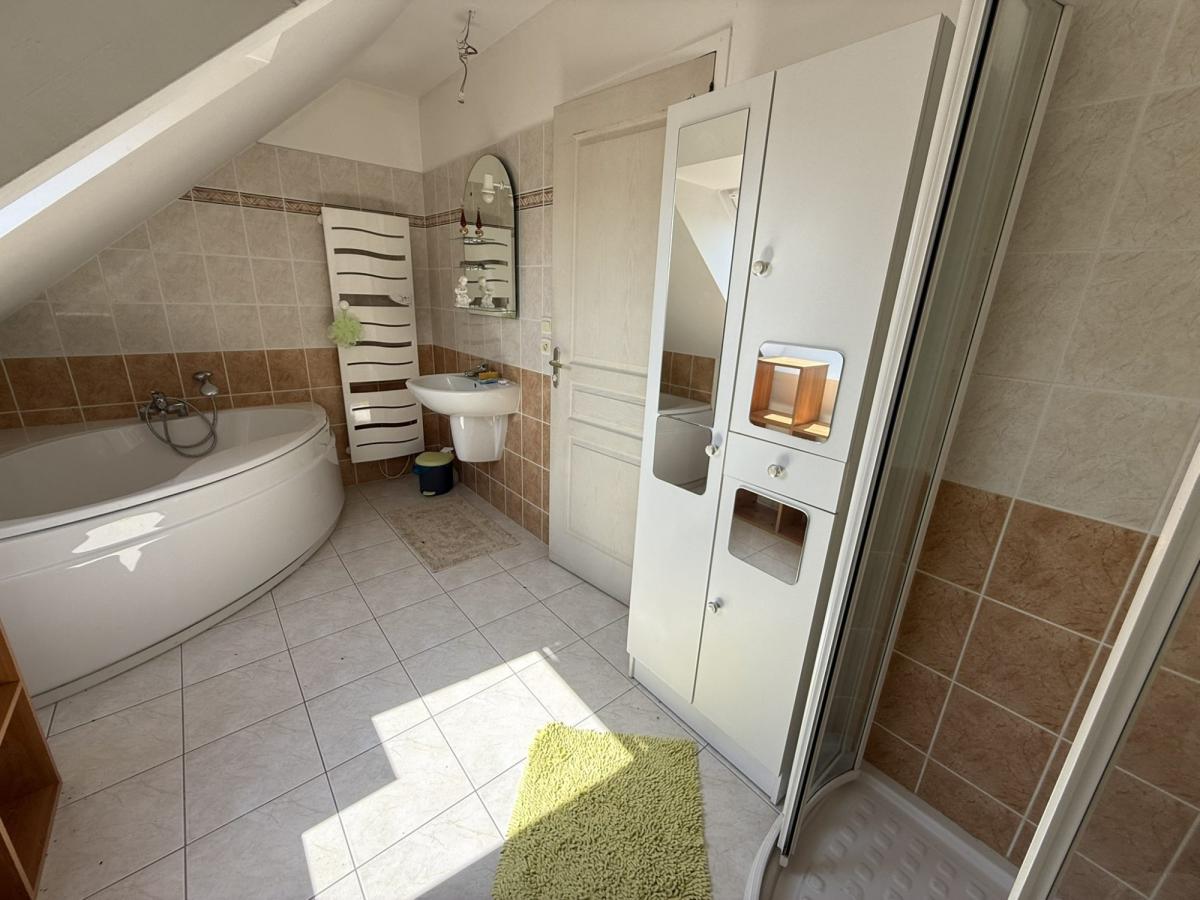 - A l'étage: palier avec coin-bureau, salle de bains avec WC + douche + baignoire, deux chambres dont une avec placards.