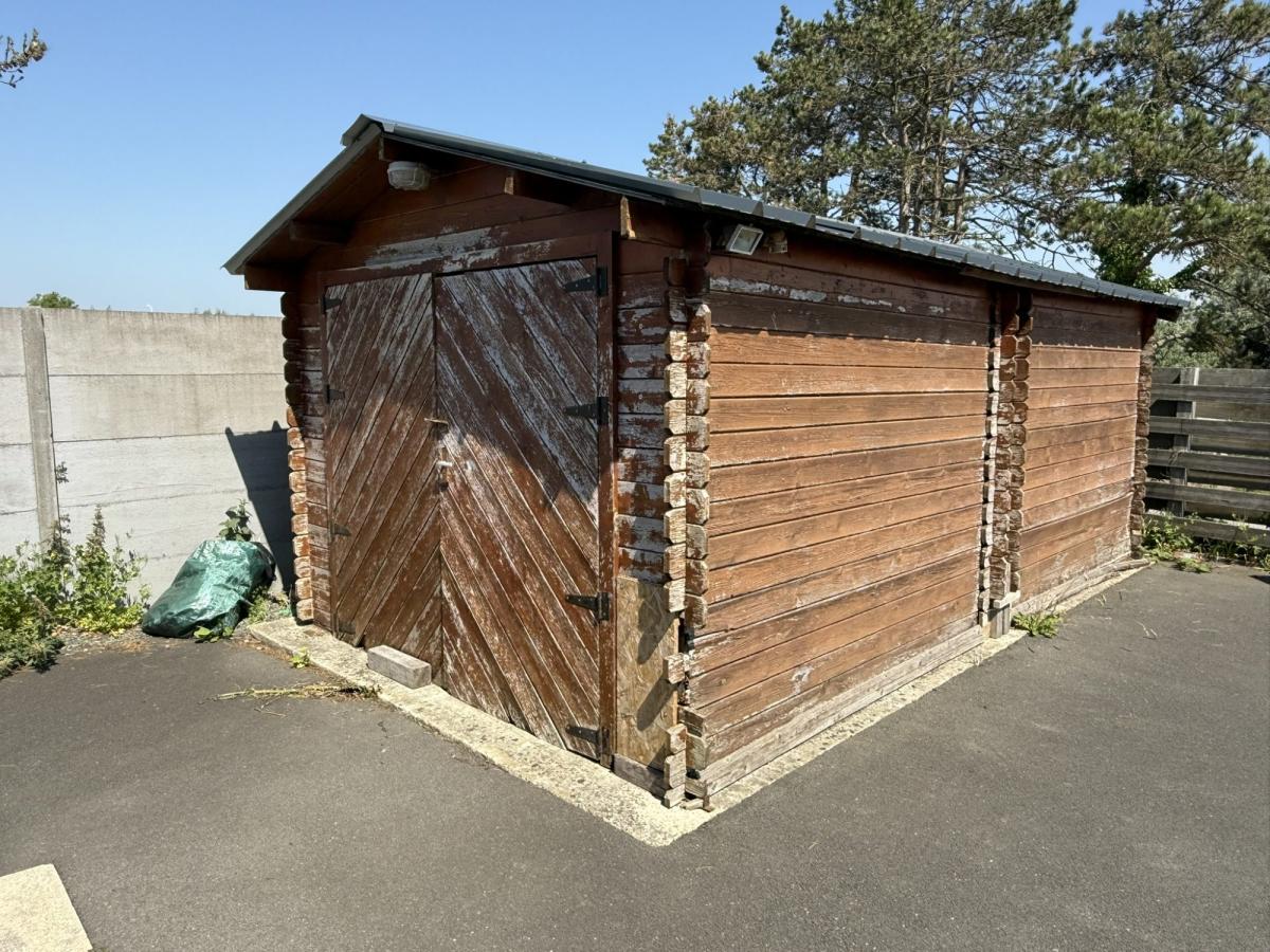 Cour bitumée avec portail électrique et garage en bois, jardin avec terrasse.