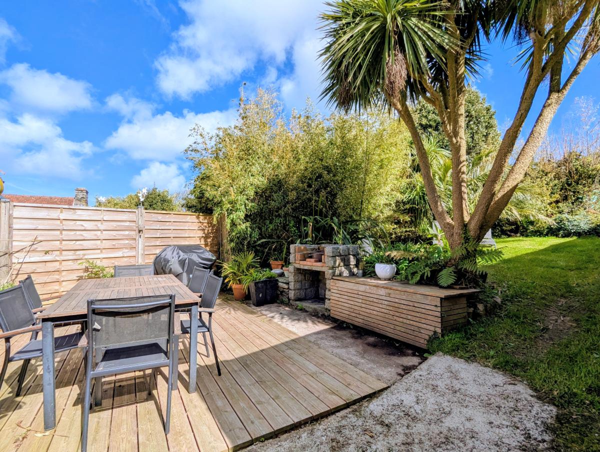 Cour sur l'avant suivi d'une terrasse ensoleillée et d'un jardin.