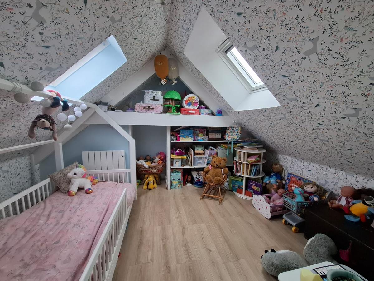 Accessible par escalier de la mezzanine : grenier aménagé en espace chambre..