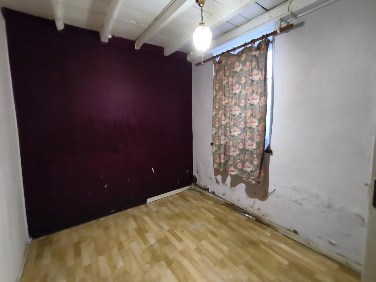 Le rez-de-chaussée est composé d'un séjour-cuisine avec poêle à fioul, une pièce, une chambre.