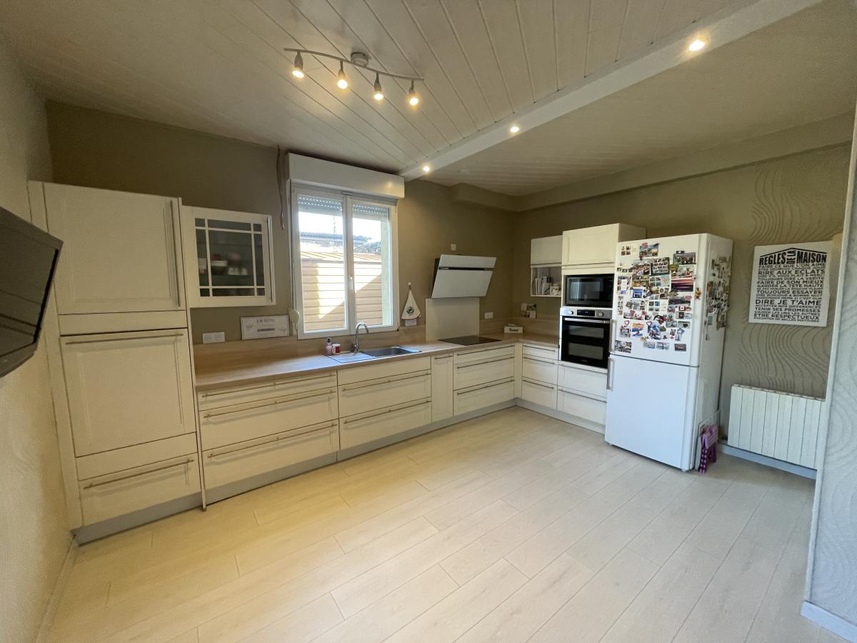 . Au RDC : cuisine équipée ouverte sur séjour/salon (pièce de vie de 51 m²), WC, buanderie, débarras avec placards, garage porte automatisée ;