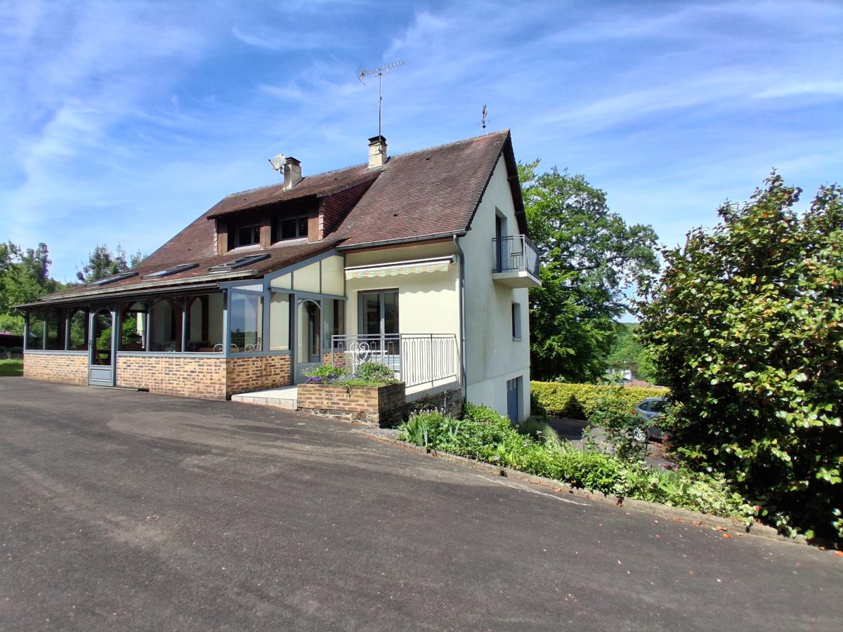 Maison confortable, jolie vue, comprenant, RDC : entrée - véranda chauffée -Pièce de vie : cuisine aménagée-salle à manger-séjour (poële à bois), chambre avec placard - salle d'eau - WC - débarras - Etage : palier - pièce de rangement - trois chambres chacune avec placard pouvant être aménagé en dressing - salle d'eau avec WC. Sous-Sol divisé en garage, chaufferie, atelier. Parc arboré. L'ensemble pour 1670 m². Chauffage fuel et bois.