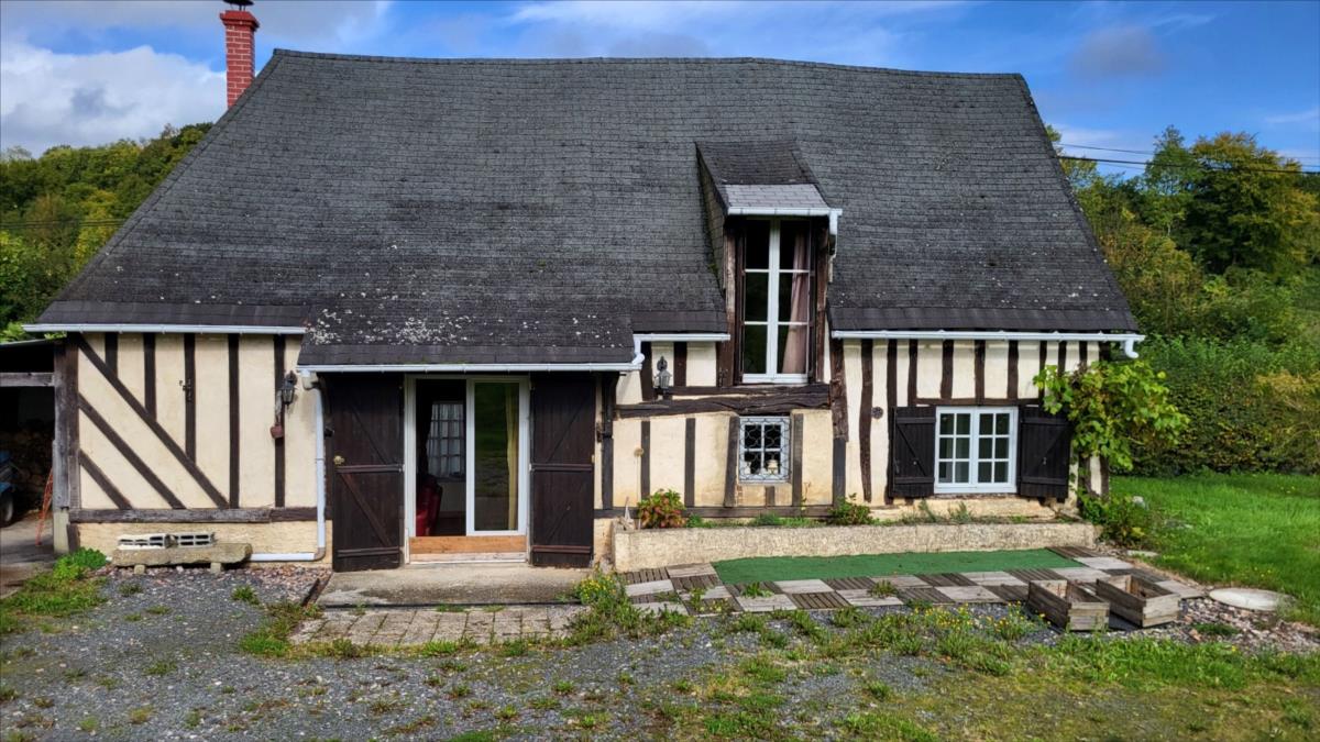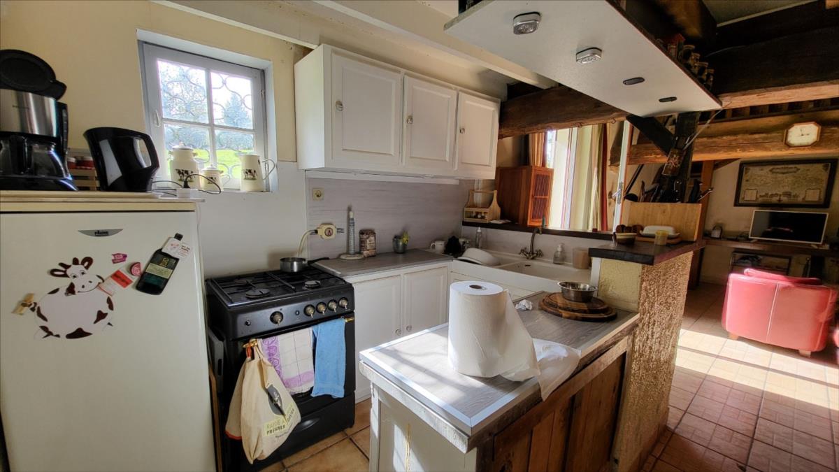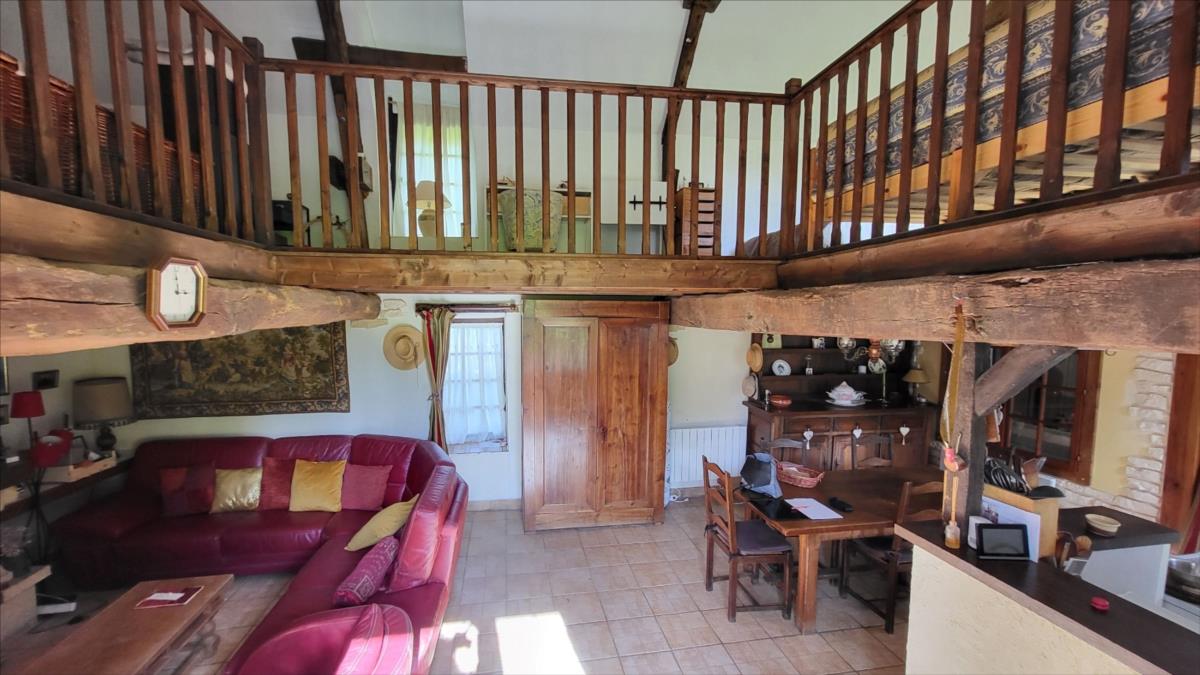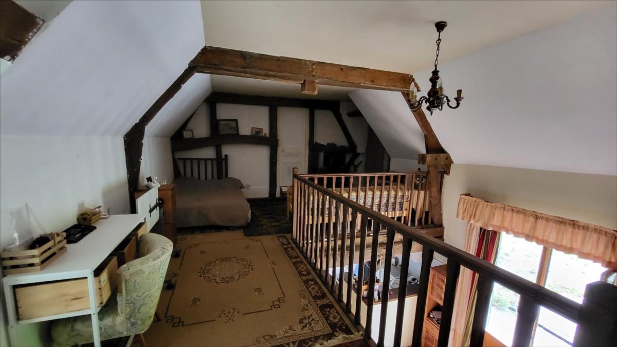 En campagne avec paysage vallonné, maison en colombage comprenant : séjour avec cheminée équipée d'un insert et en partie en toit cathédrale, coin cuisine, une chambre, salle de douche avec wc ; à l'étage : mezzanine, et une chambre. Appentis attenant ; Garage préfabriqué.