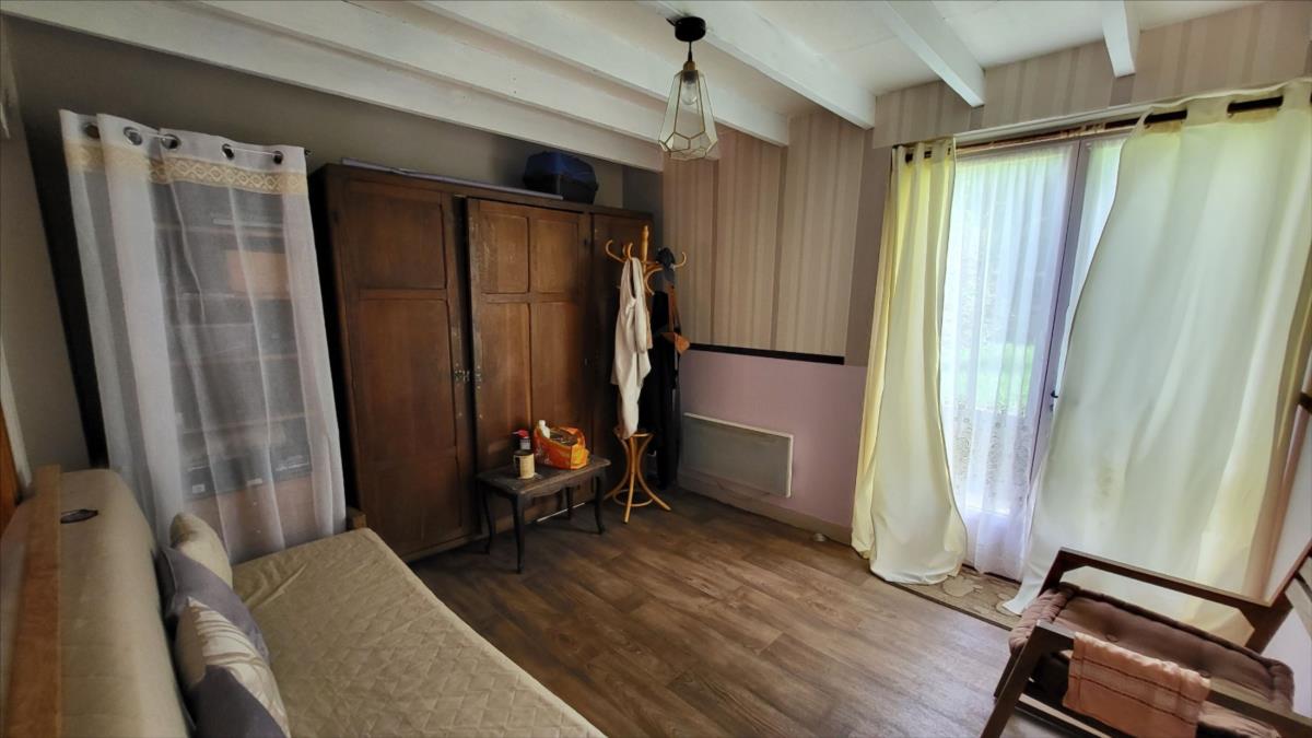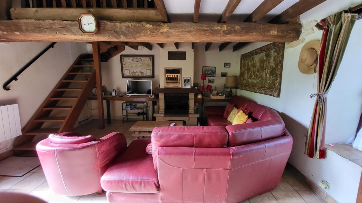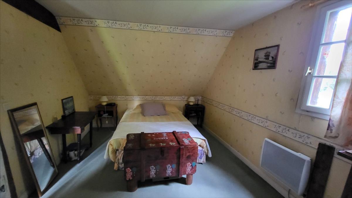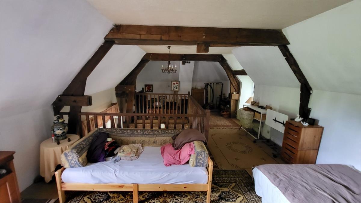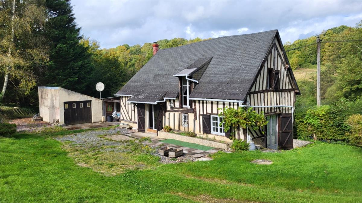 En campagne avec paysage vallonné, maison en colombage comprenant : séjour avec cheminée équipée d'un insert et en partie en toit cathédrale, coin cuisine, une chambre, salle de douche avec wc ; à l'étage : mezzanine, et une chambre. Appentis attenant ; Garage préfabriqué.