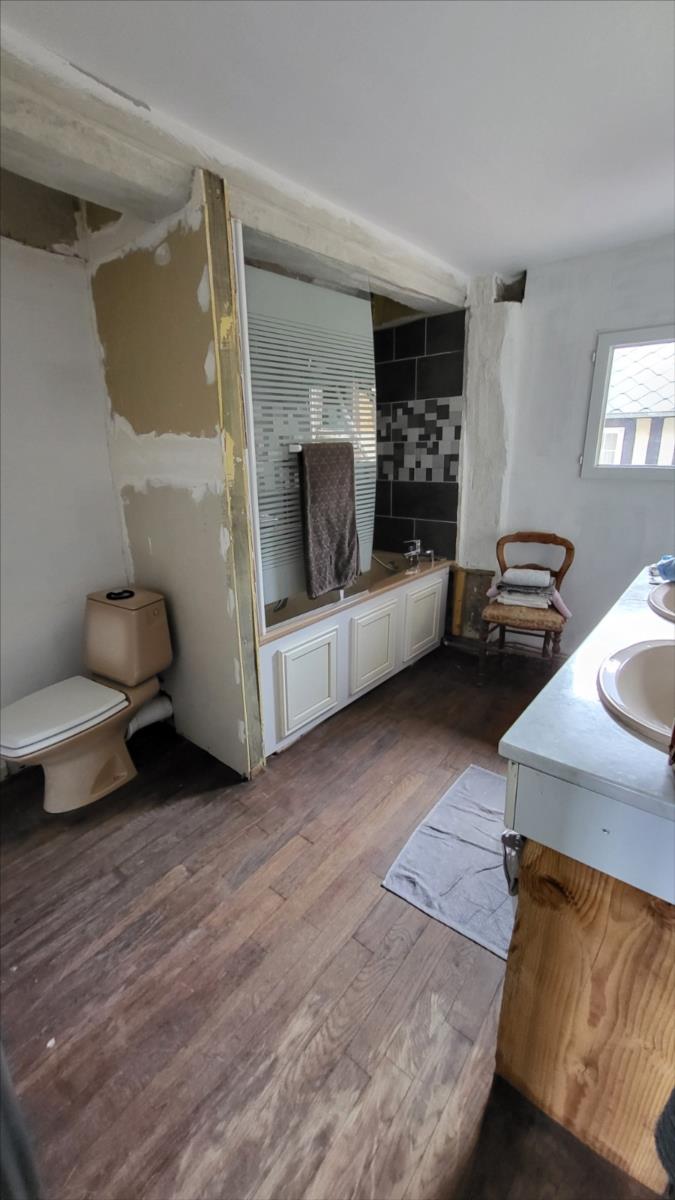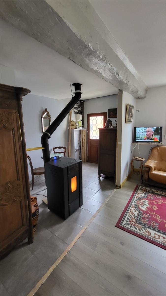 Maison mitoyenne rénovée : Entrée avec poêle à granulés ouvert sur séjour avec escalier ancien, petite cuisine aménagée; au 1er étage : petit palier desservant une chambre avec salle de bains et wc privatifs avec pompe à chaleur air/air ; au 2ème étage : une chambre mandardée à finir (arrivée d'eau, et électricité). Les informations sur les risques auxquels ce bien est exposé sont disponibles sur le site Géorisques : www. georisques. gouv. fr