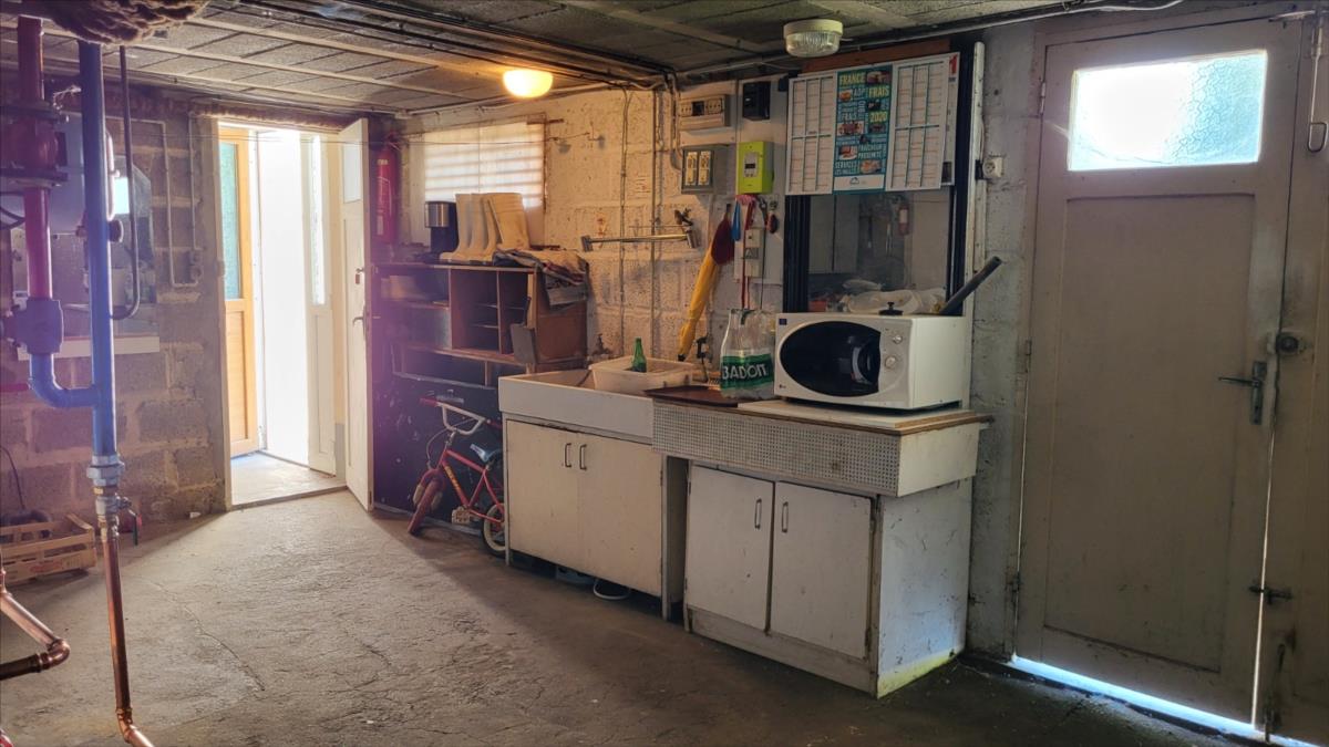 Pavillon surélevé comprenant en rez-de-jardin : garage avec chaufferie (chaudière très récente au fuel), buanderie, atelier, une pièce; au 1er étage : couloir avec placards desservant : séjour, cuisine, trois chambres, salle de douche, wc séparés; tout à l'égout. Volets roulants électriques. Chauffage central au fioul.