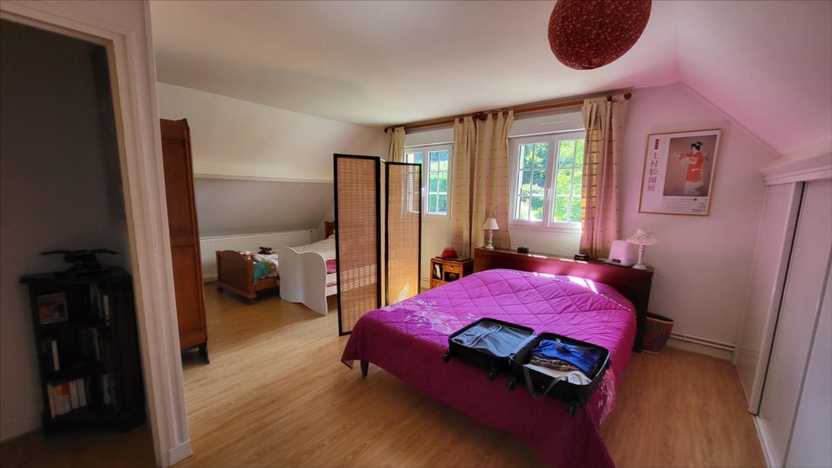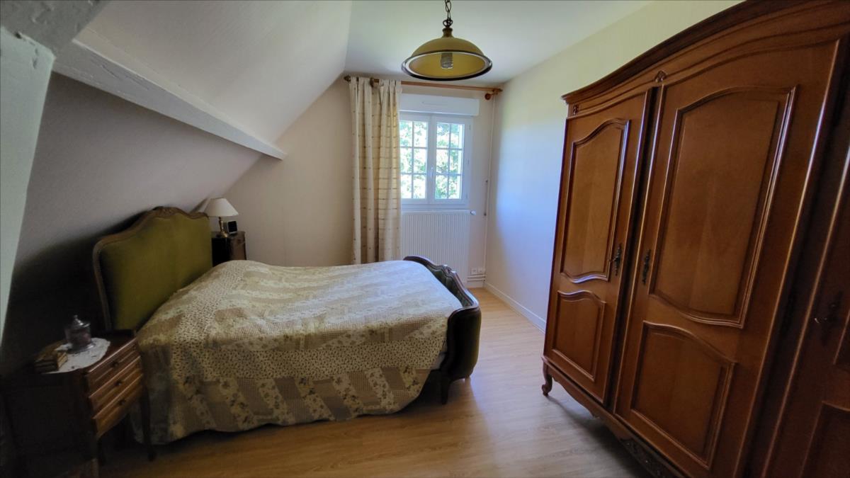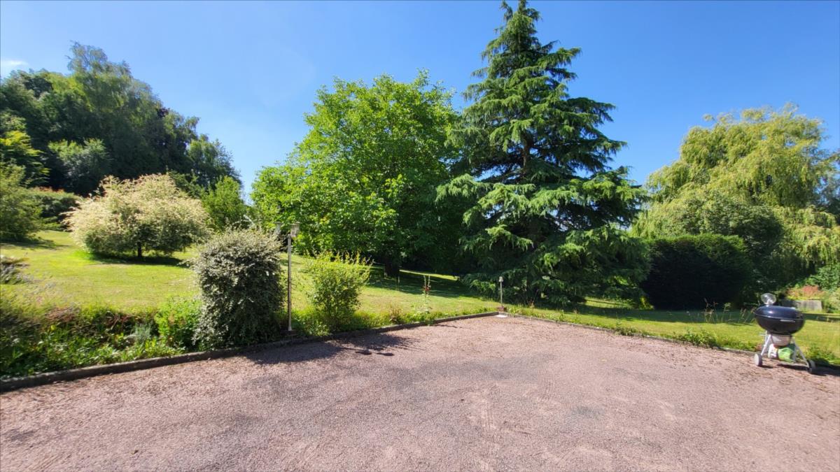 Dans un quartier au calme, à 1,5 km du centre ville de Vimoutiers, maison d'environ 133 m² bien entretenue comprenant : entrée avec placard-penderie, séjour avec baie vitrée donnant sur terrasse à l'extérieur et avec cheminée équipée d'un insert, cuisine aménagée et équipée (four, plaque de cuisson, hotte, lave-vaisselles), dégagement avec escalier desservant une salle de douche avec wc, une chambre ; à l'étage : couloir desservant trois chambres avec placard dont une avec balcon, salle de bains , wc séparés; sous-sol complet comprend partie garage, atelier, chaufferie et buanderie, avec adoucisseur d'eau, l'ensemble sur terrain arboré, avec source, allée goudronnée pour accès garage. Portail d'entrée électrique.