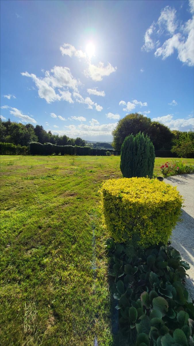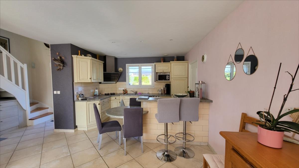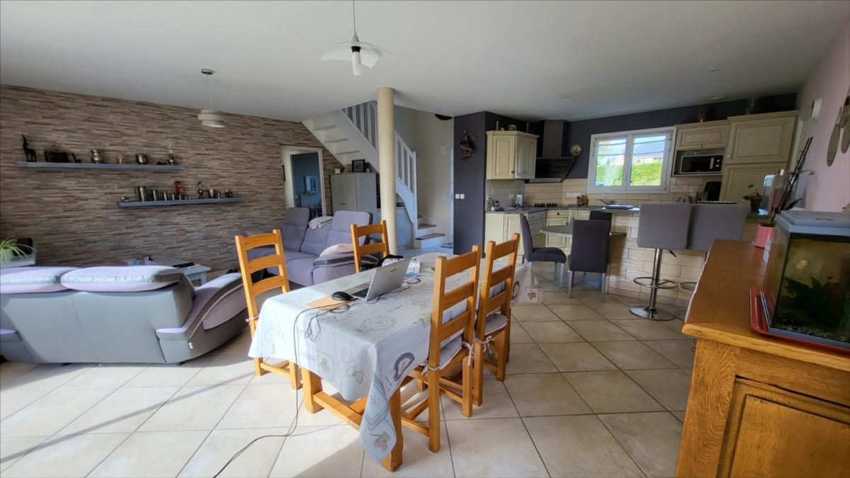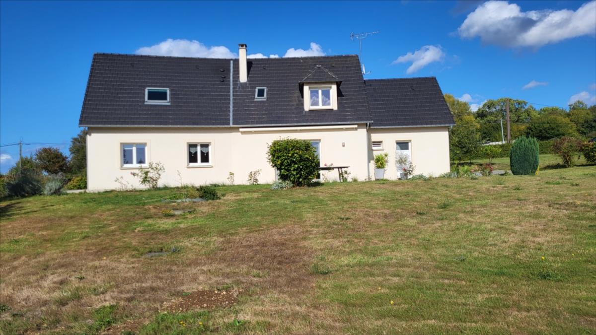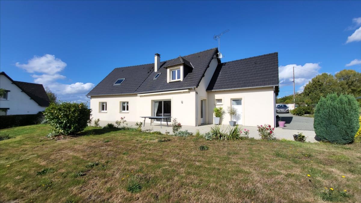 En campagne, mais non isolée, maison bien entretenue comprenant séjour ouvert sur cuisine aménagée et équipée, couloir desservant deux chambres, bureau, salle de bains et wc ; à l'étage : palier et couloir desservant trois chambres dont une très grande, salle de douche avec wc. Garage et buanderie avec pompe à chaleur récente; Chauffage par géothermie. Terrain avec plan d'eau et terrasse.