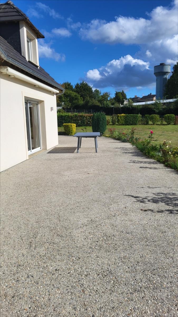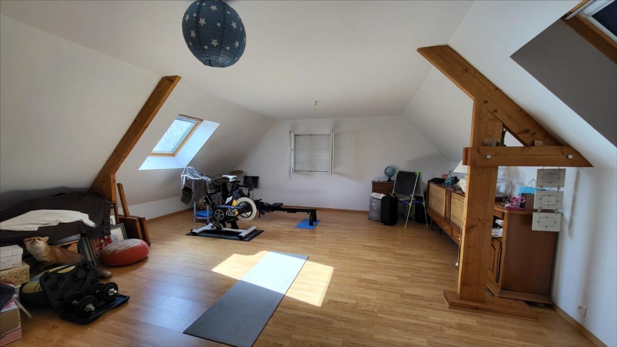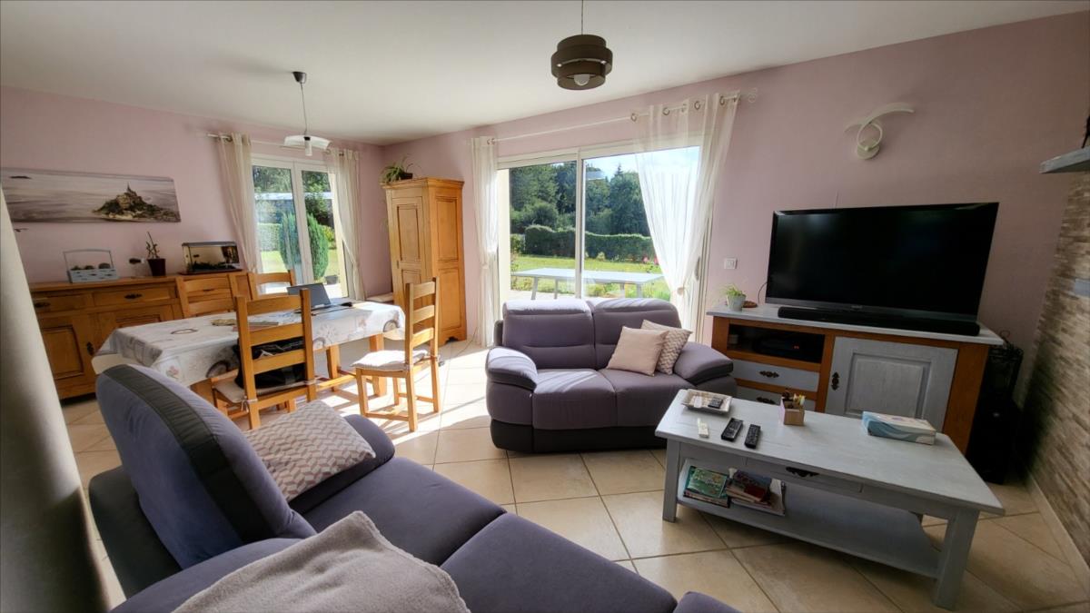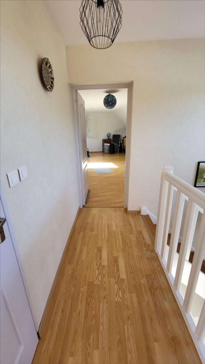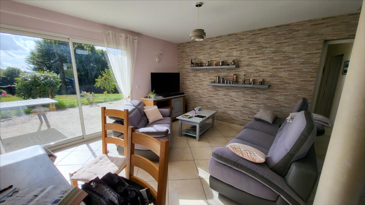 En campagne, mais non isolée, maison bien entretenue comprenant séjour ouvert sur cuisine aménagée et équipée, couloir desservant deux chambres, bureau, salle de bains et wc ; à l'étage : palier et couloir desservant trois chambres dont une très grande, salle de douche avec wc. Garage et buanderie avec pompe à chaleur récente; Chauffage par géothermie. Terrain avec plan d'eau et terrasse.