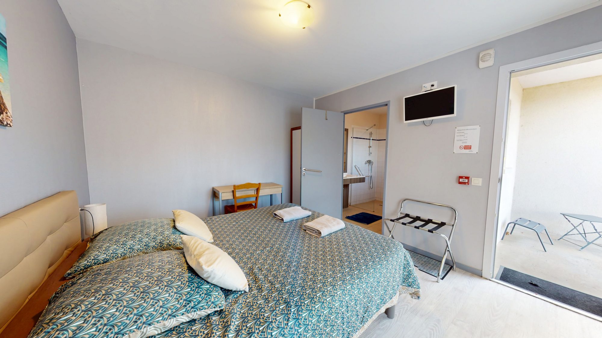 Terrasse et parking derrière sur lequel un autre bâtiment comprenant une chambre PMR avec salle d'eau.