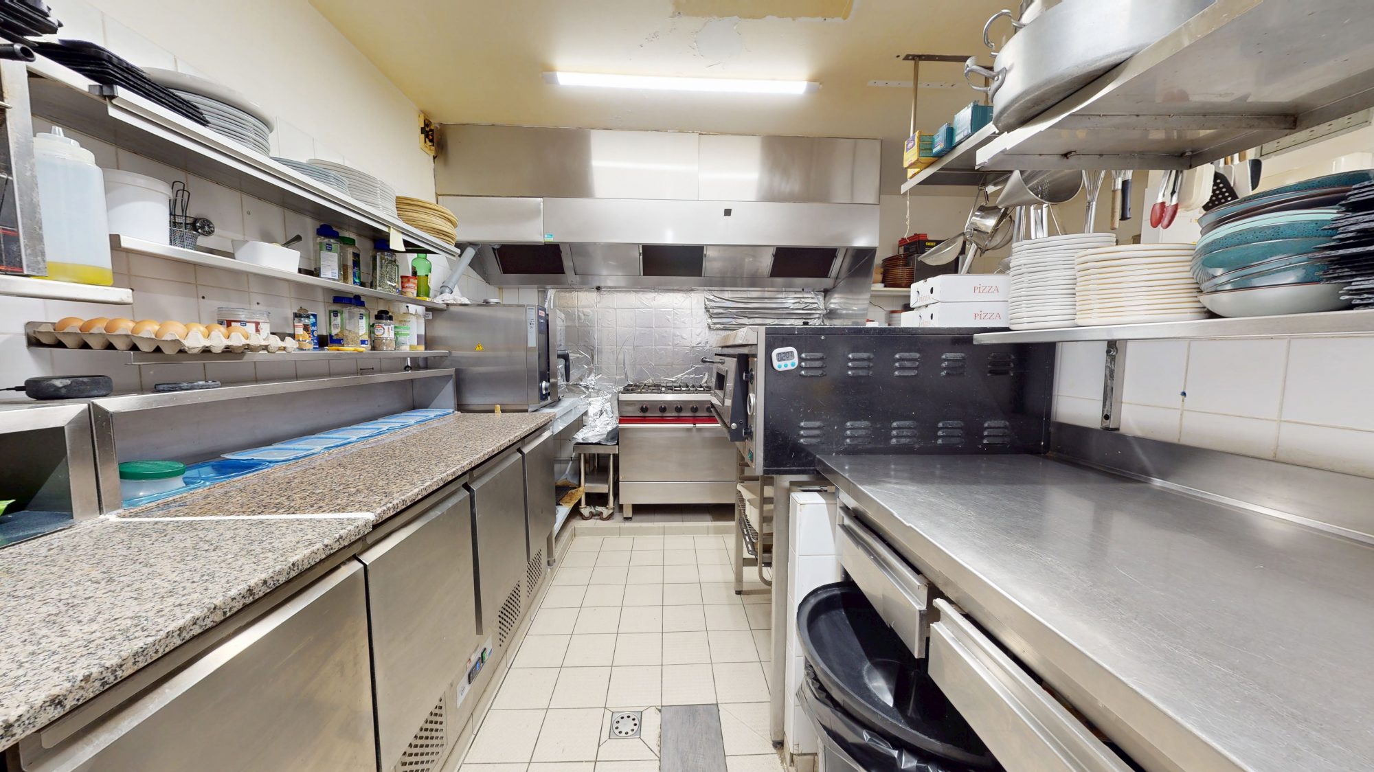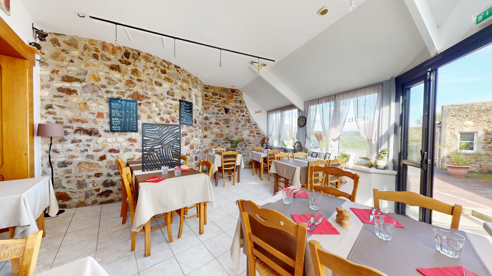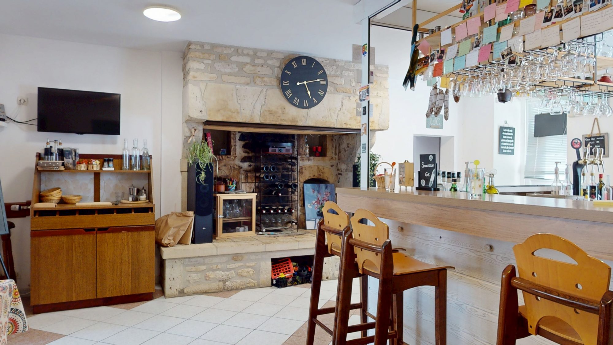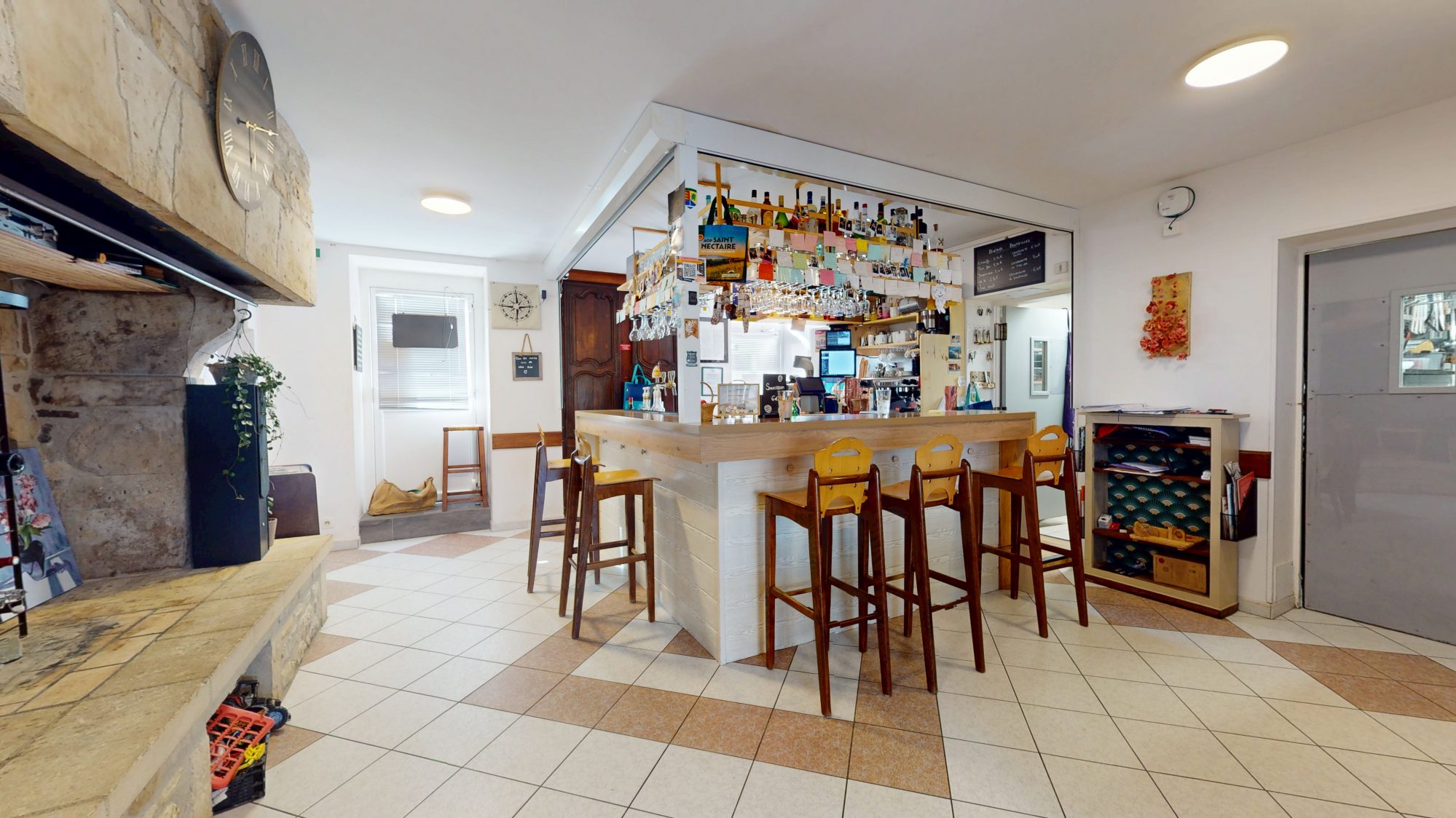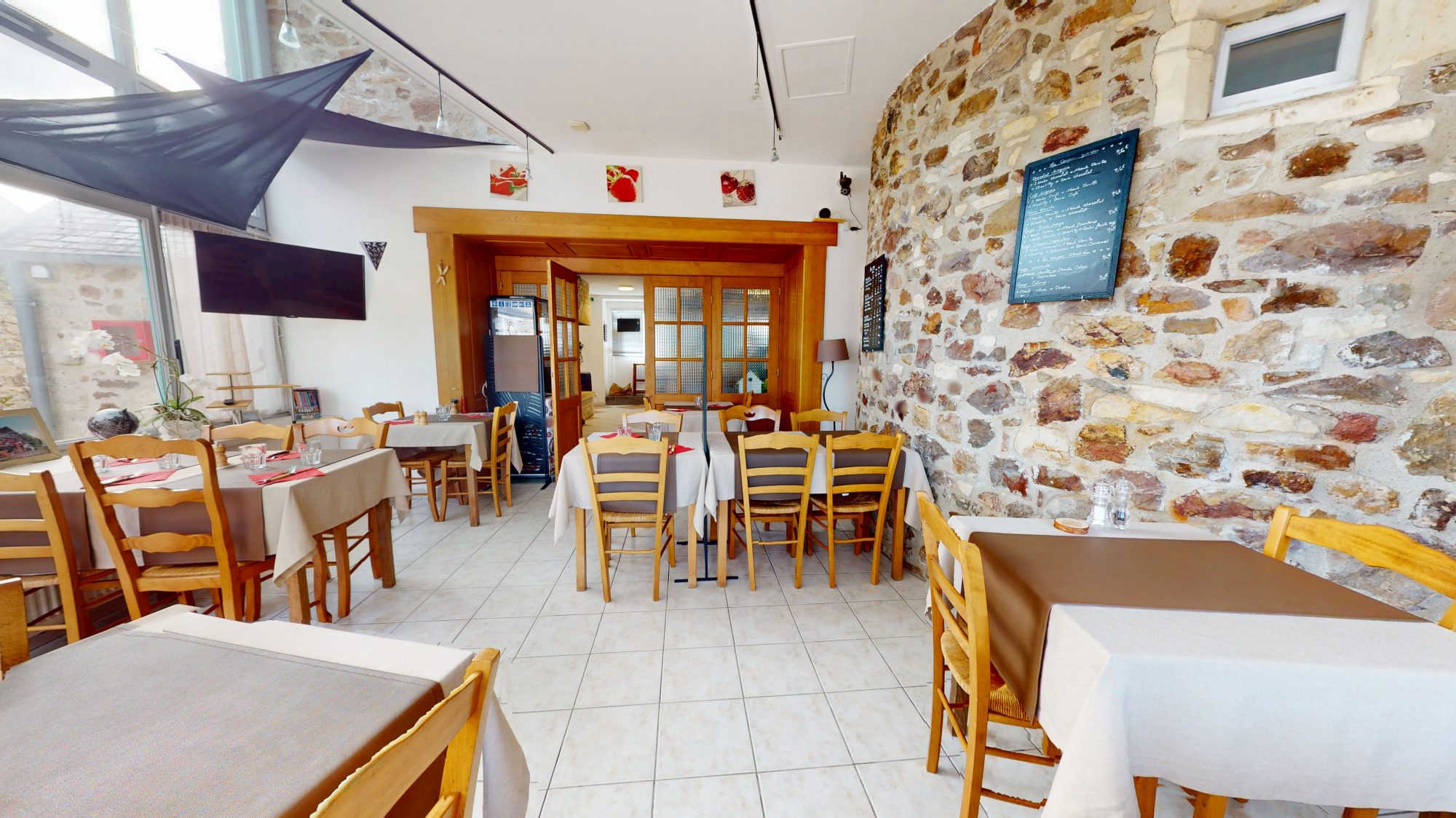 - au rez-de-chaussée : bar, salle de restaurant, WC, cuisine, réserves et épicerie ;