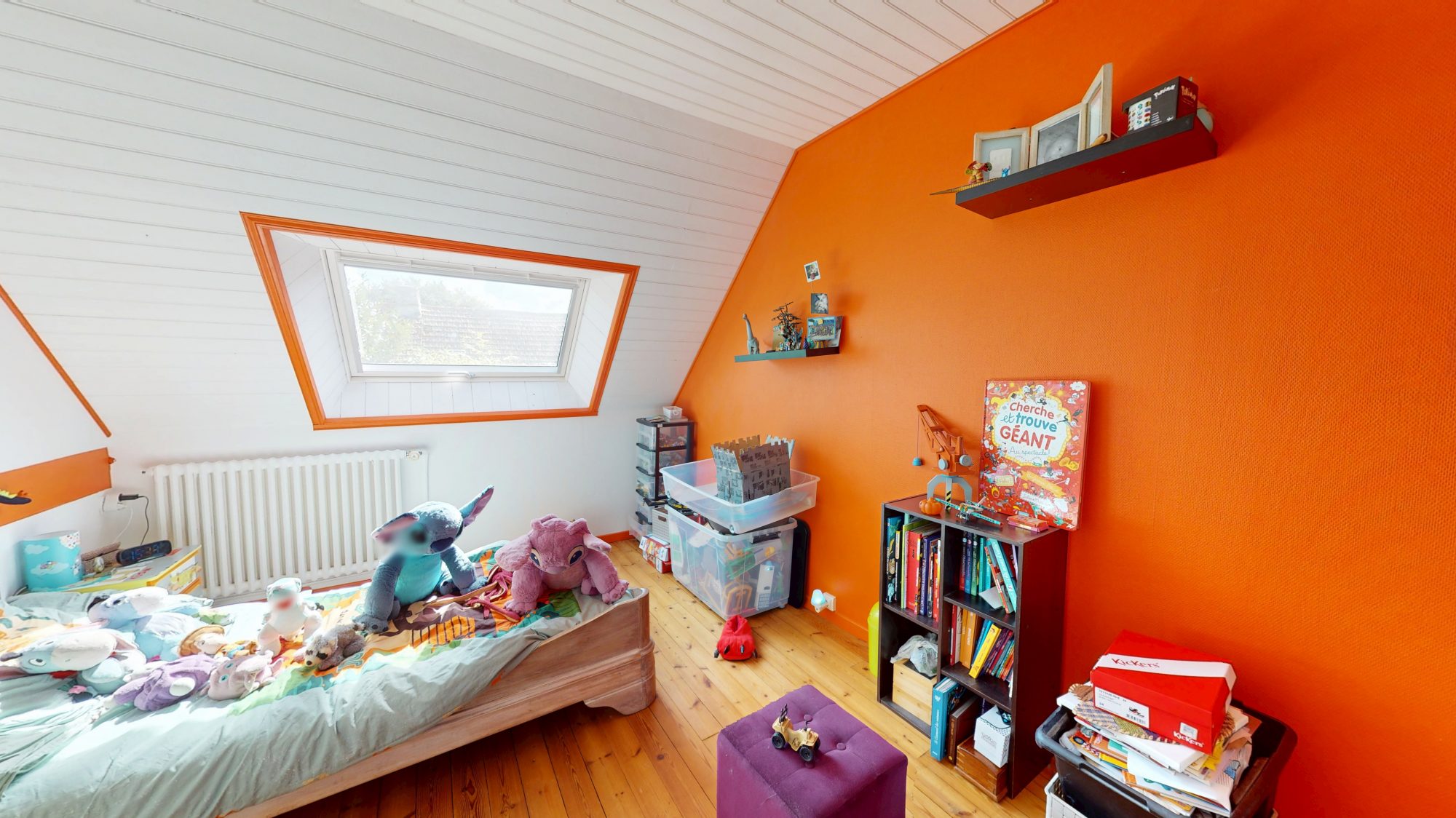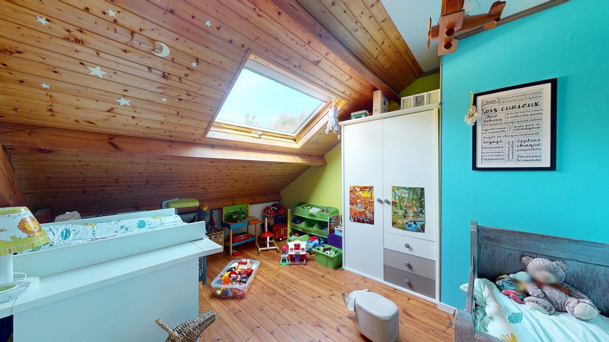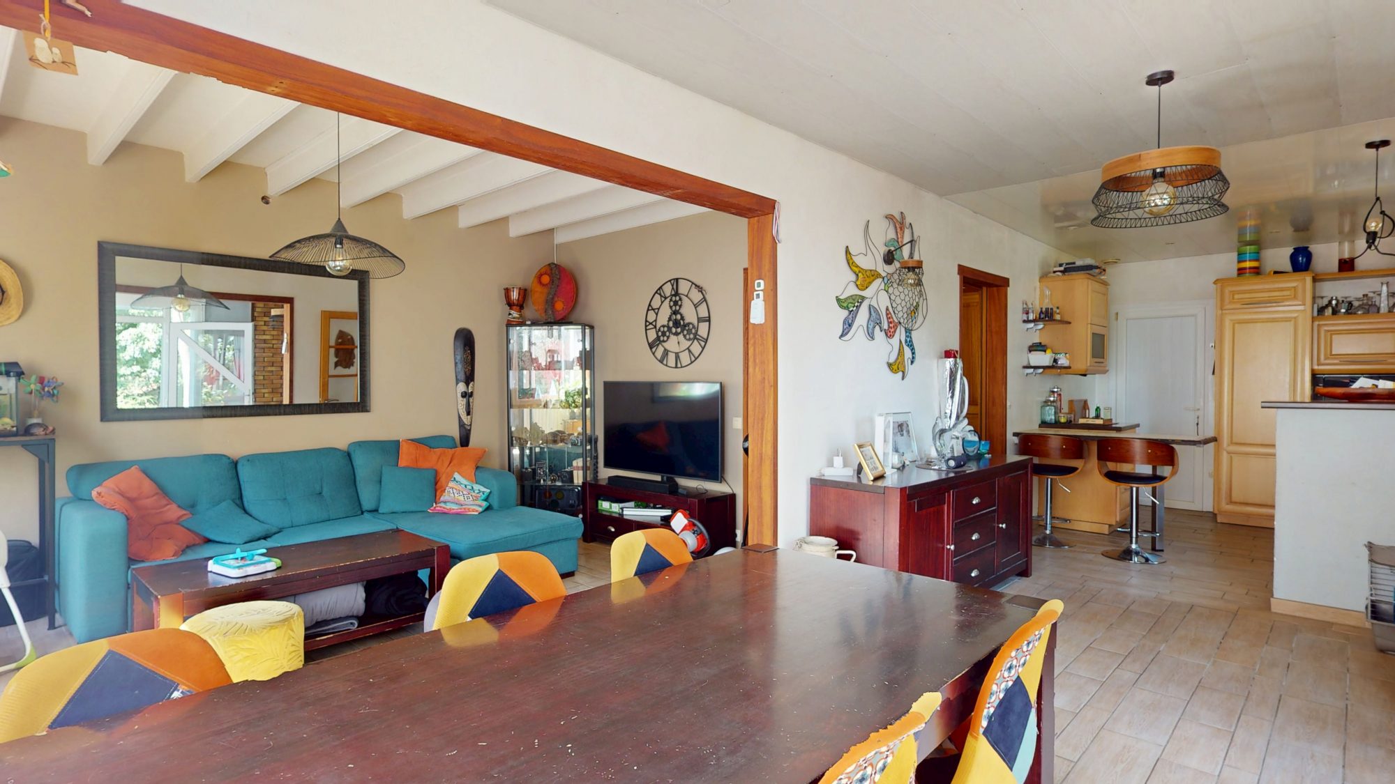 - au rez-de-chaussée : séjour avec poêle à bois, salon, cuisine ouverte, bureau, WC, débarras ;