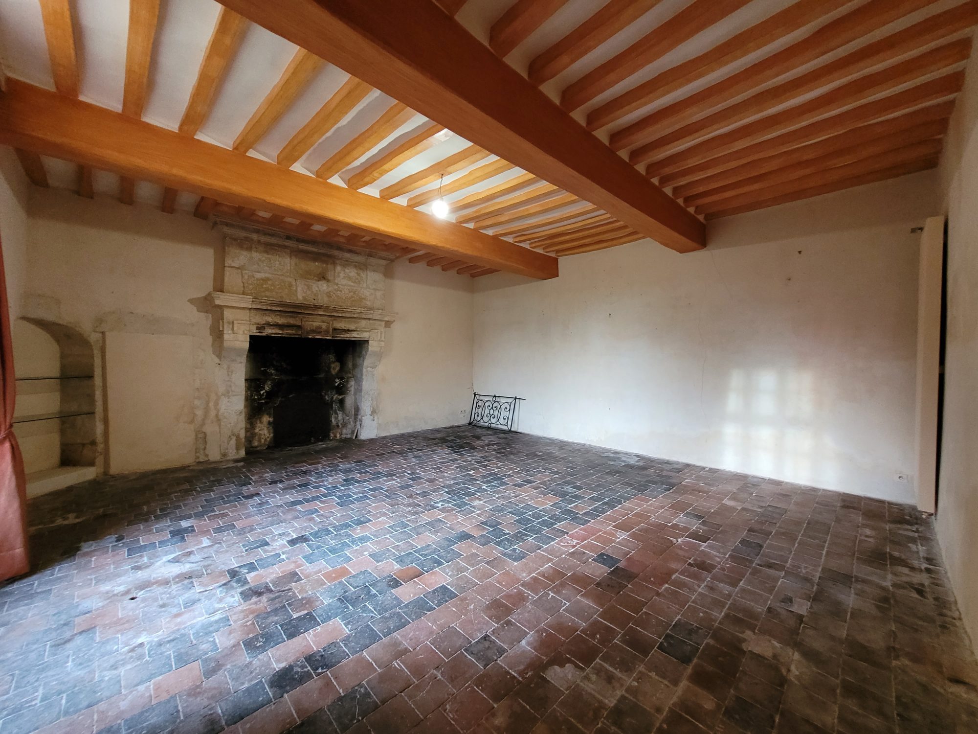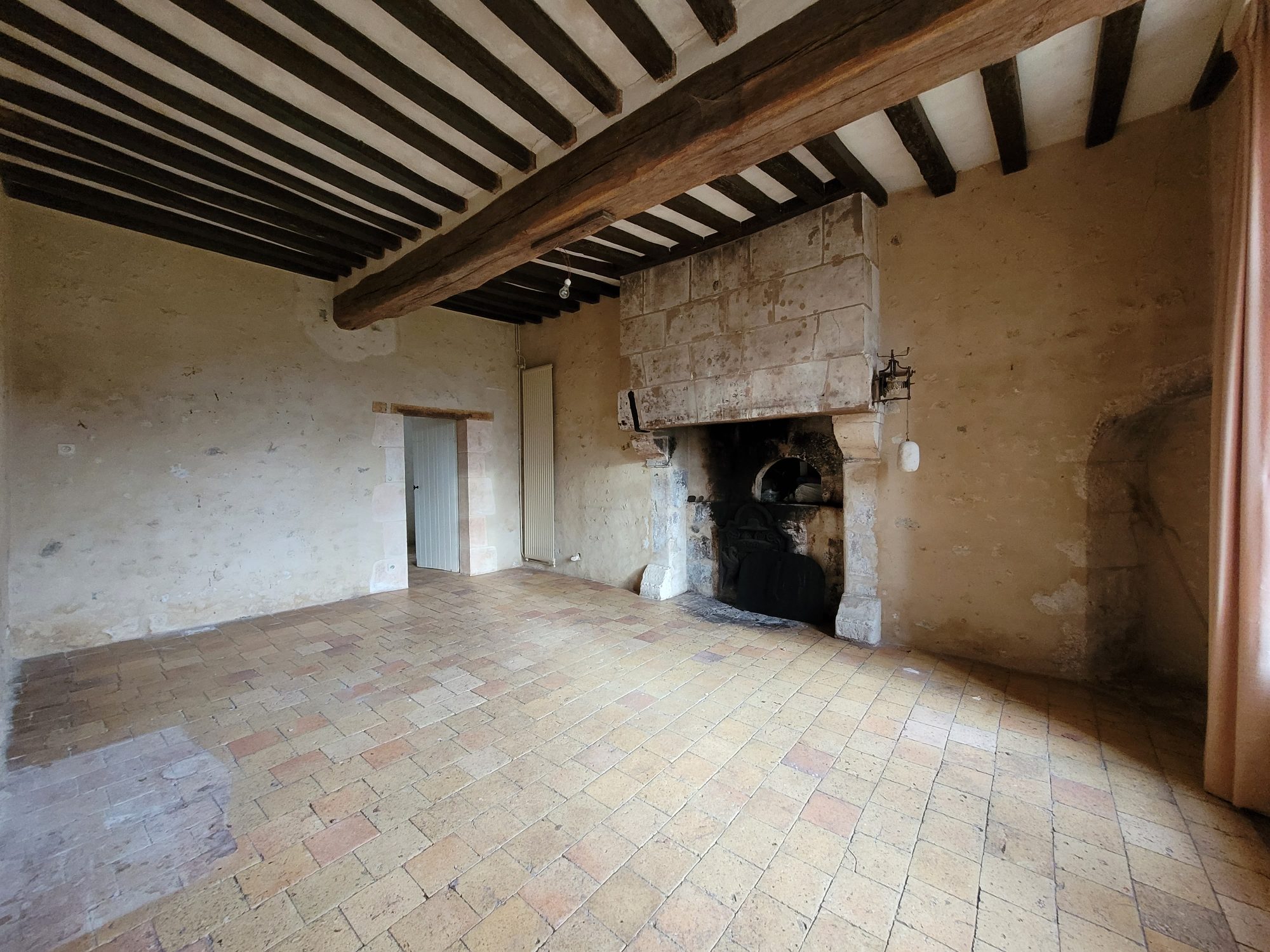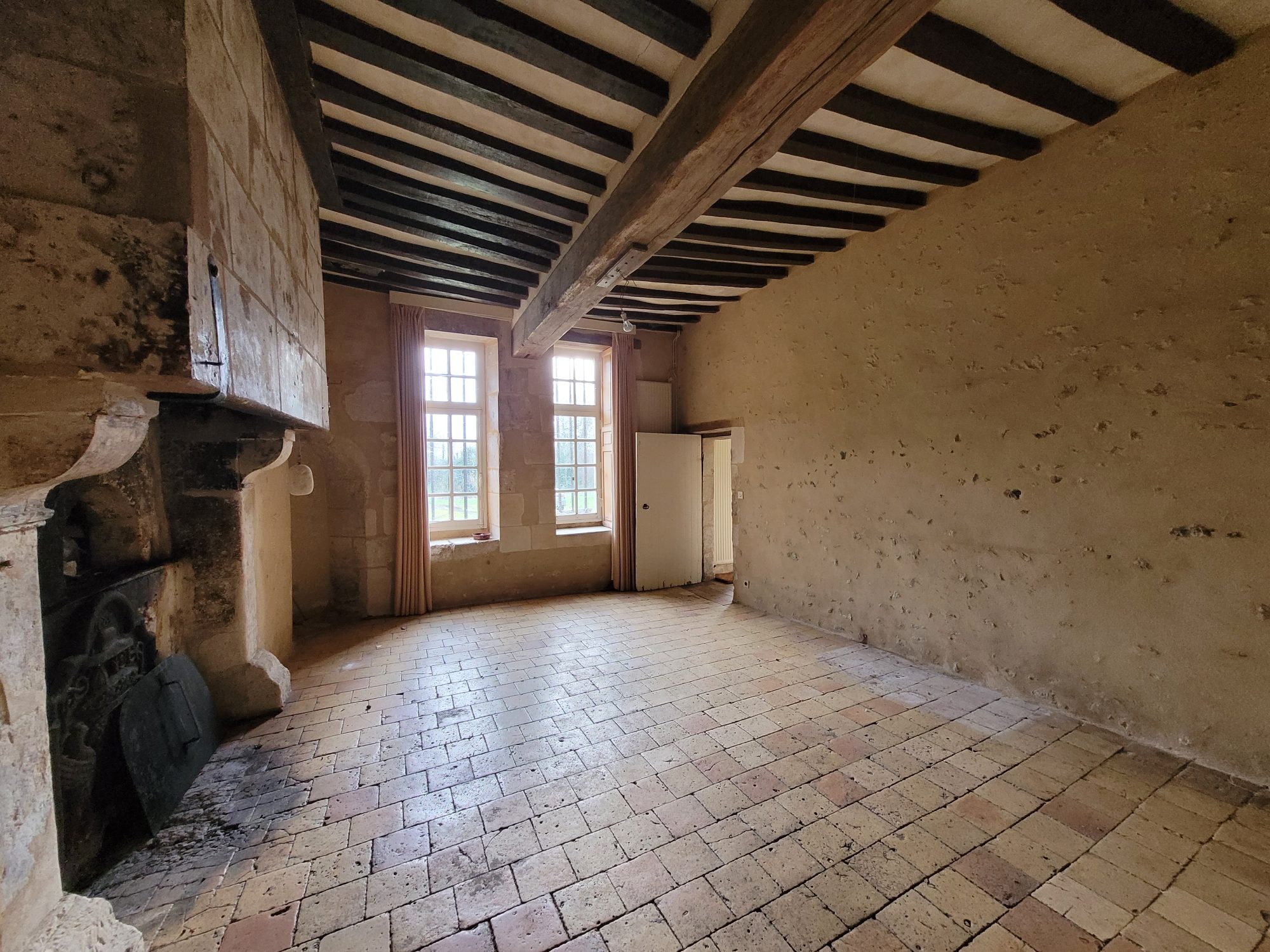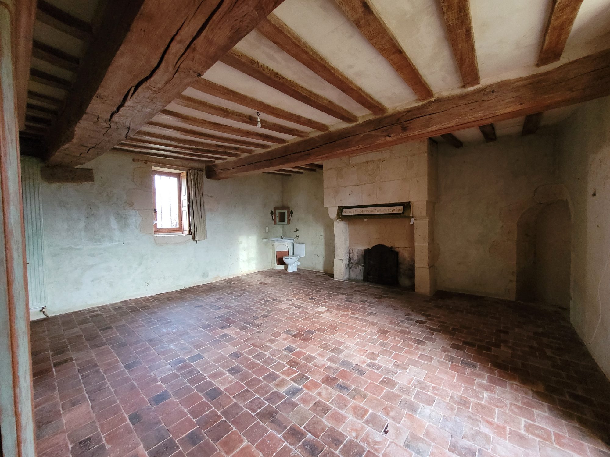 A l’étage : dégagement desservant deux grandes chambres avec chacune leur cheminée et une avec WC et point d’eau. Grenier aménageable sous combles.