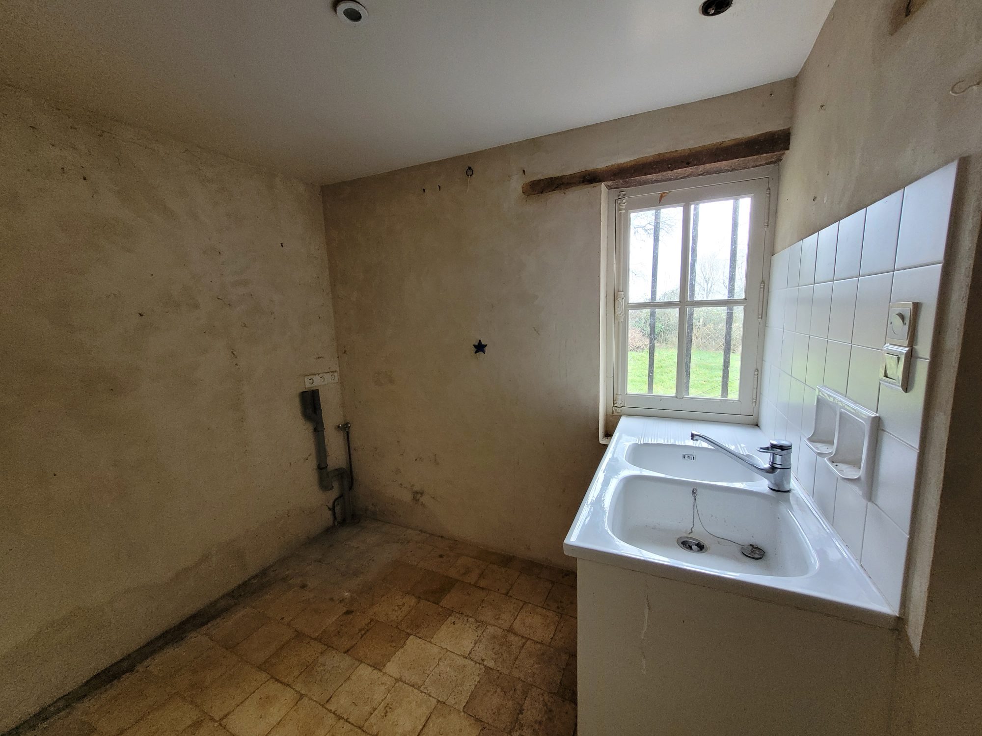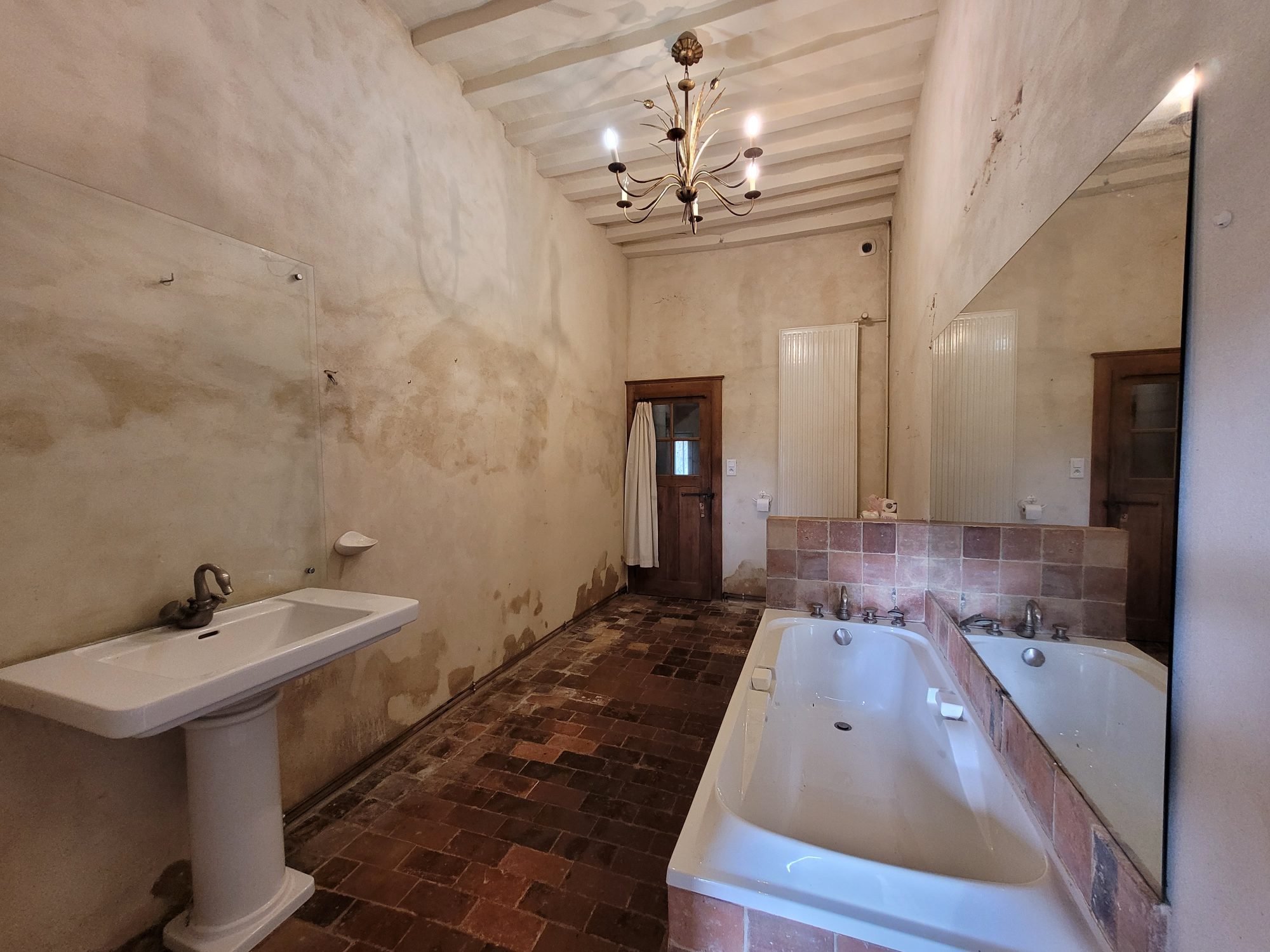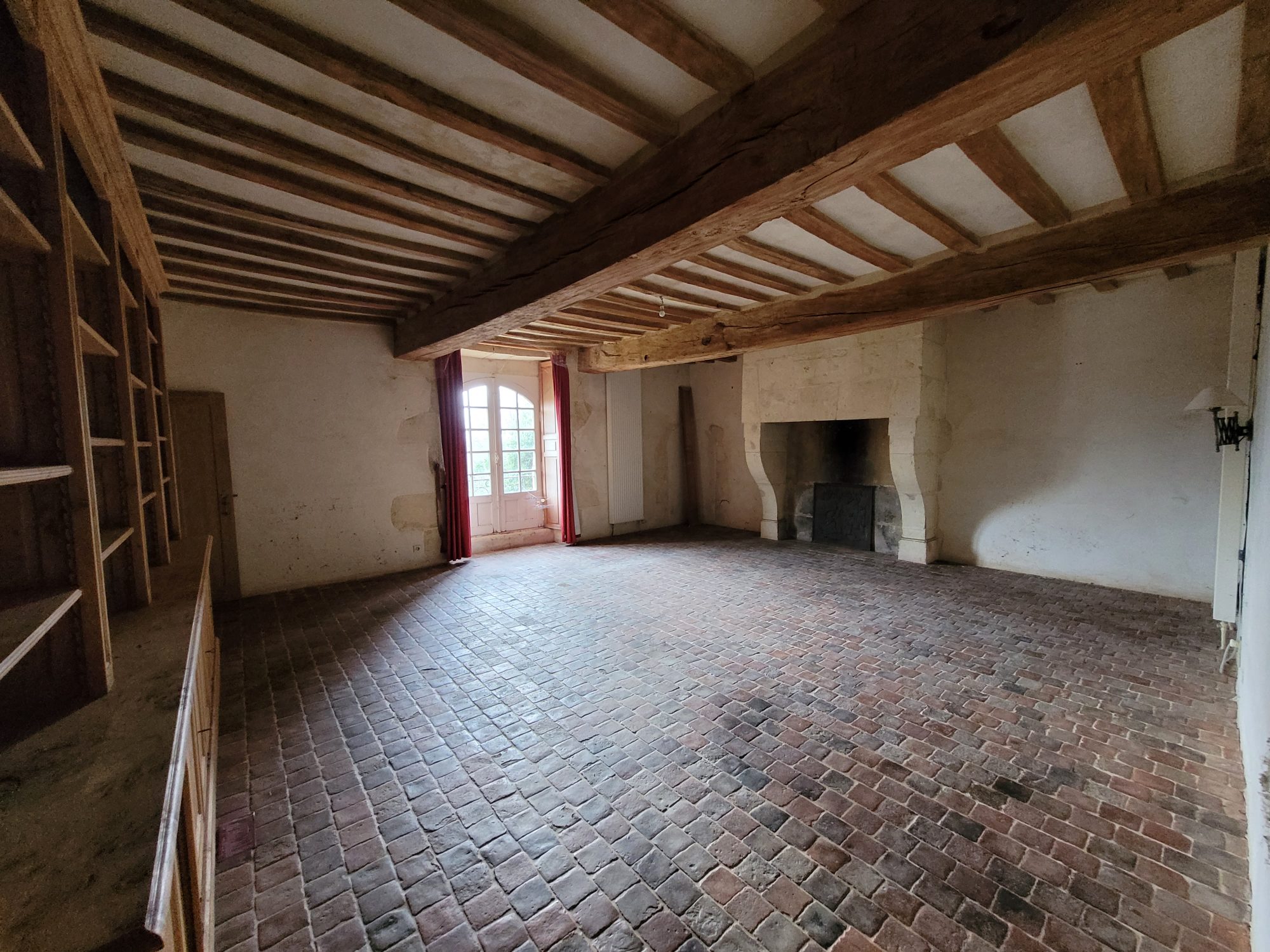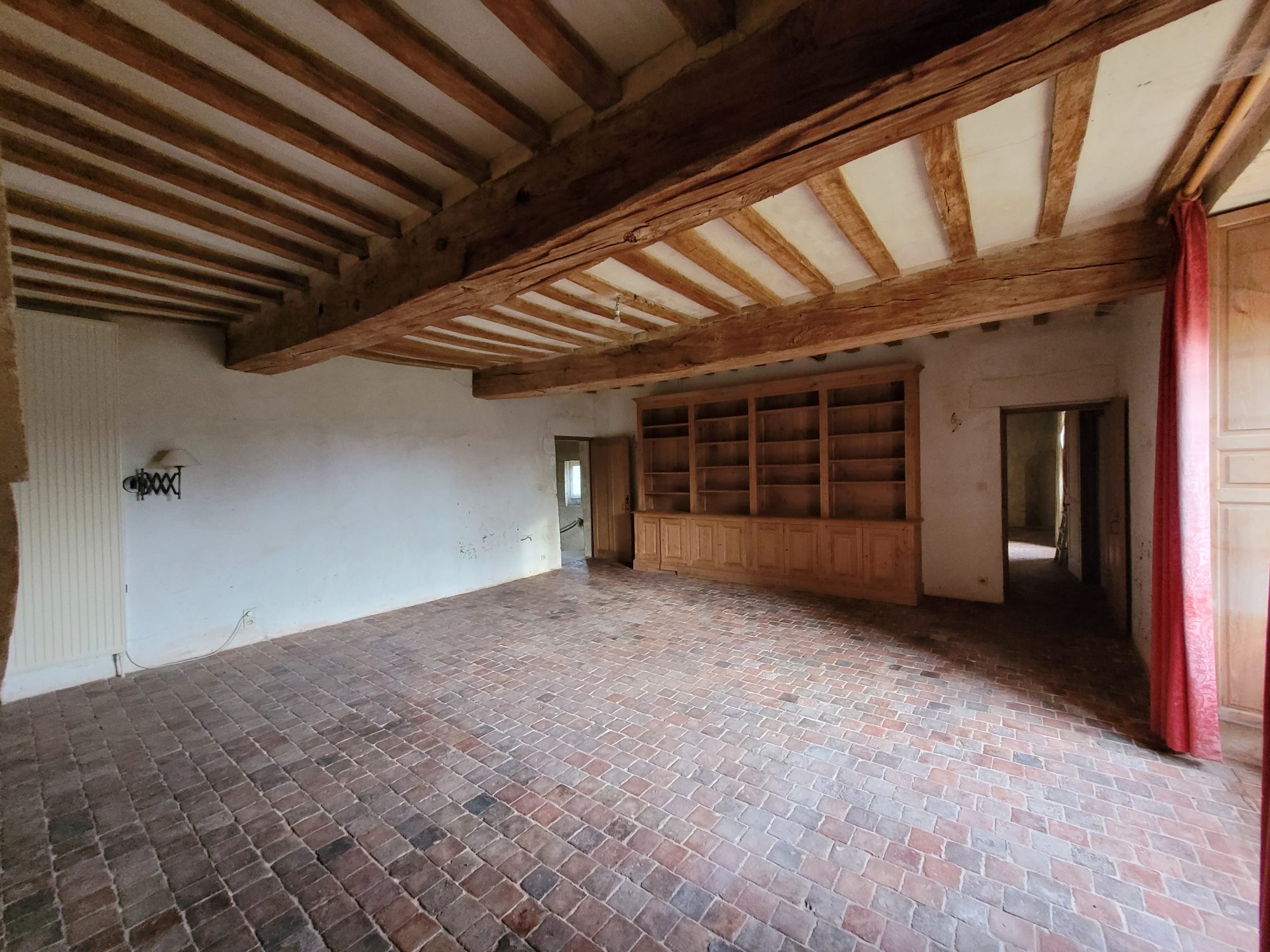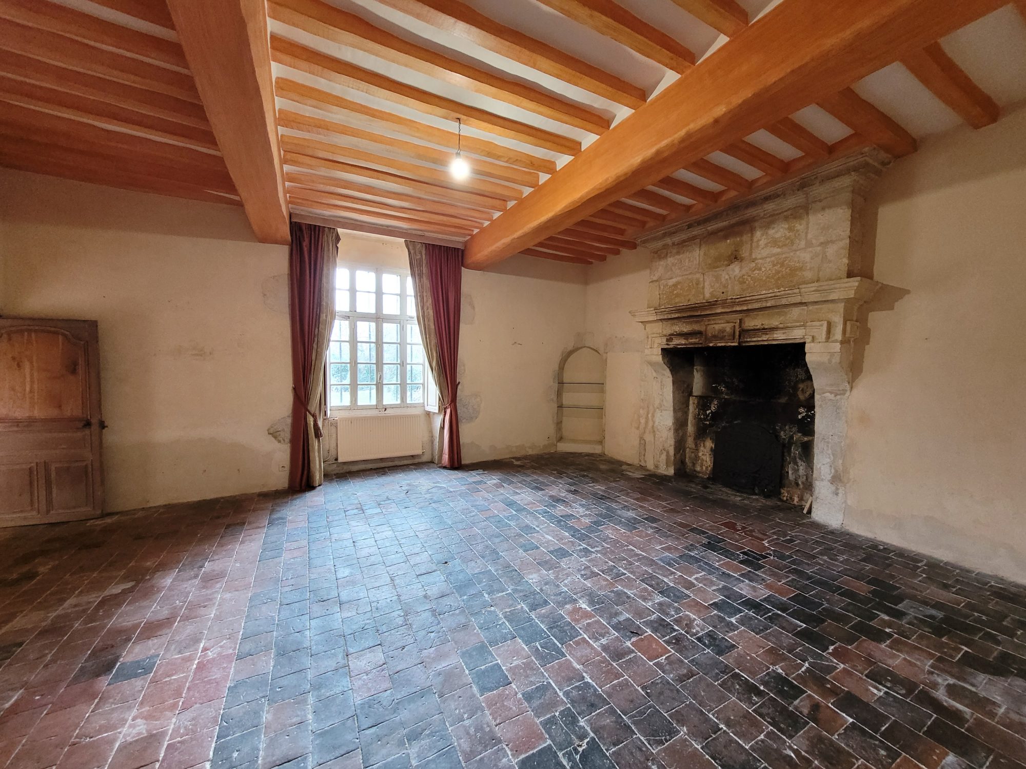 A l’étage : dégagement desservant deux grandes chambres avec chacune leur cheminée et une avec WC et point d’eau. Grenier aménageable sous combles.