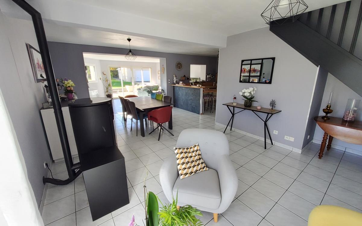- au rez-de-chaussée : séjour-salon avec poêle à granules, cuisine ouverte aménagée et équipée, salon donnant sur terrasse plein sud, chambre, wc, salle d'eau.