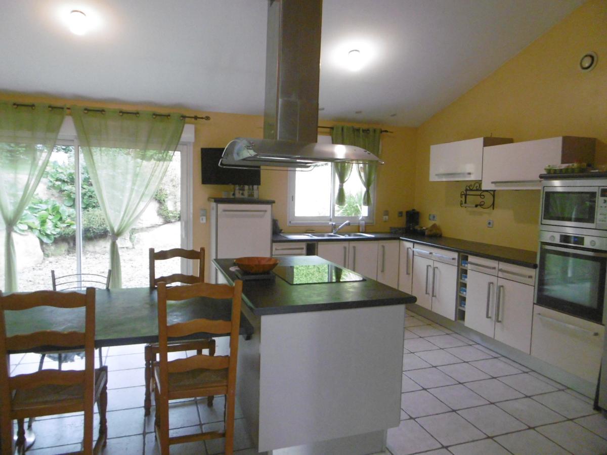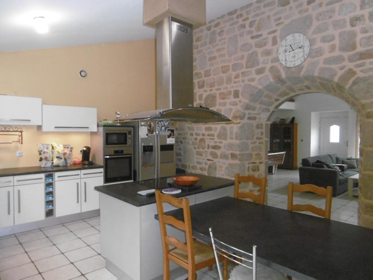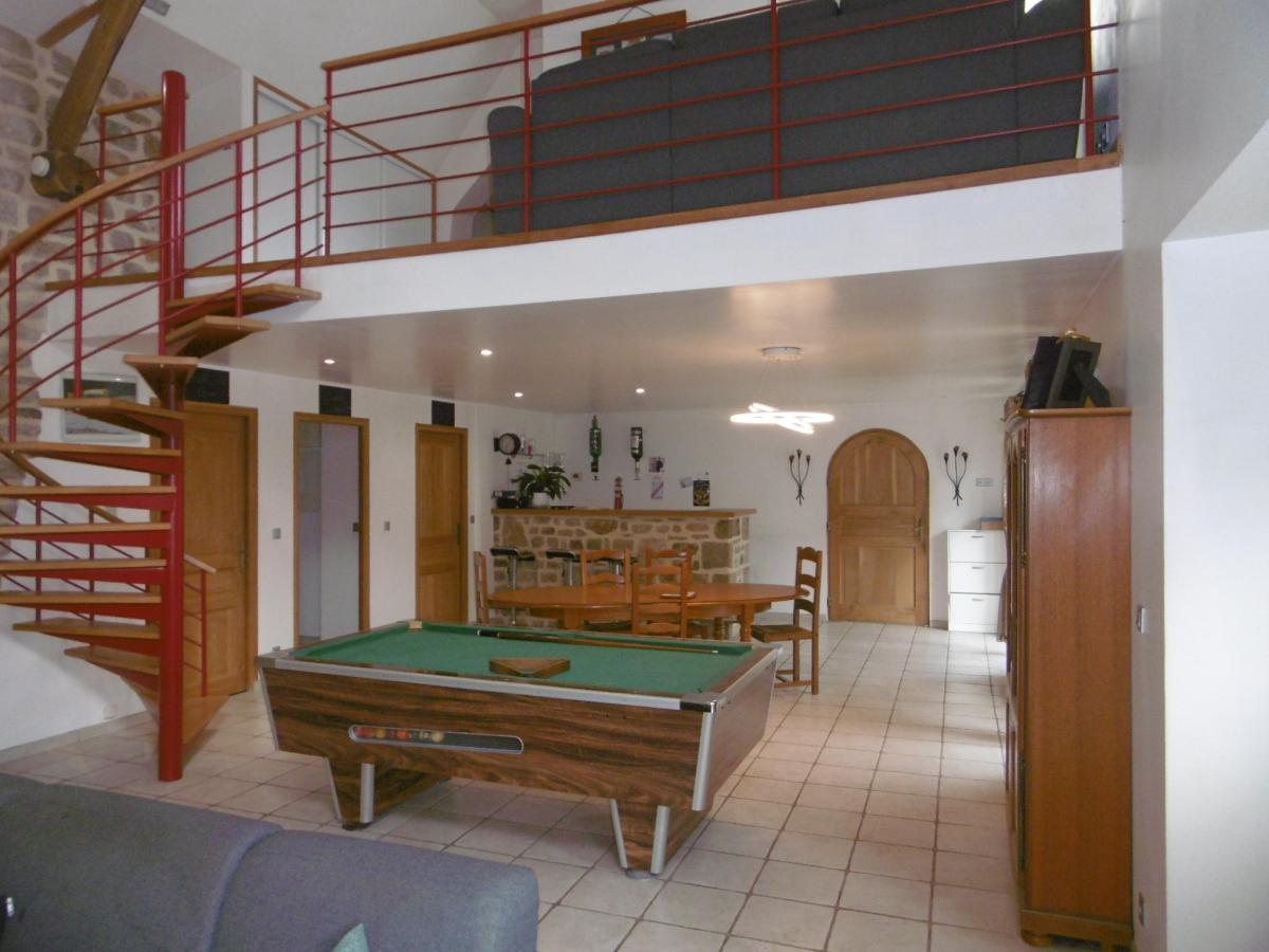 - au rez-de-chaussée : une grande pièce de vie (salon- salle à manger avec plafond cathédrale) et cheminée insert, une grande cuisine aménagée, une chambre, une salle de bains avec placards, un W.C., à la suite atelier, bureau et garage,