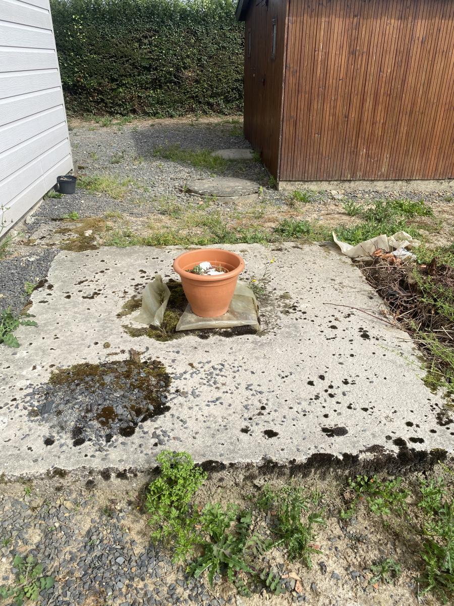 Abri en bois et terrain avec cour.