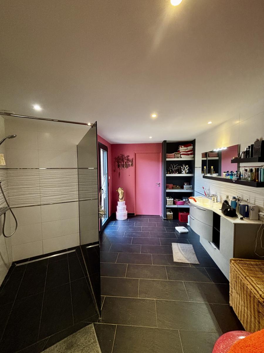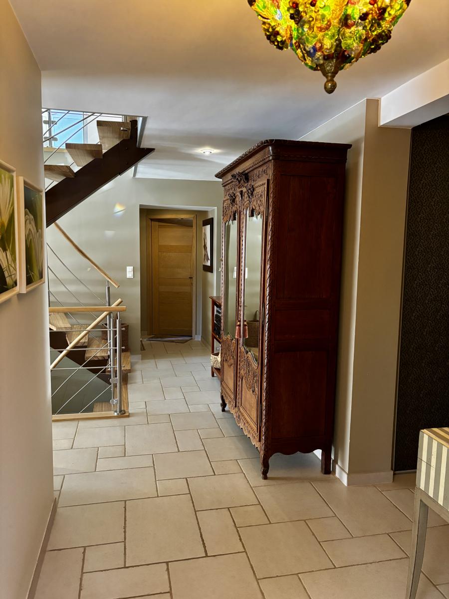 - Au rez-de-chaussée : belle entrée, cuisine aménagée et équipée, salon en demi-niveau, suite parentale avec salle d’eau, dressing et buanderie/lingerie, salle de sport avec sauna, chaufferie et WC.