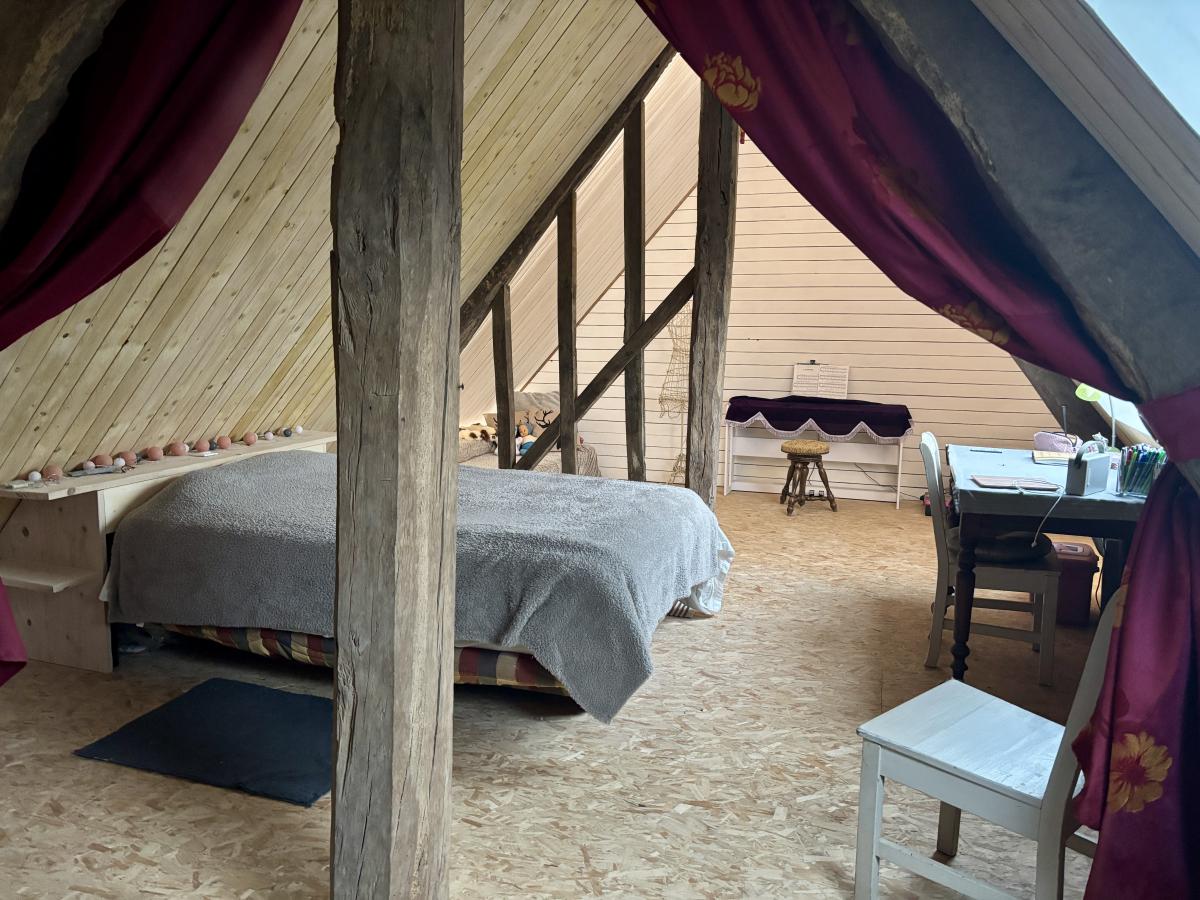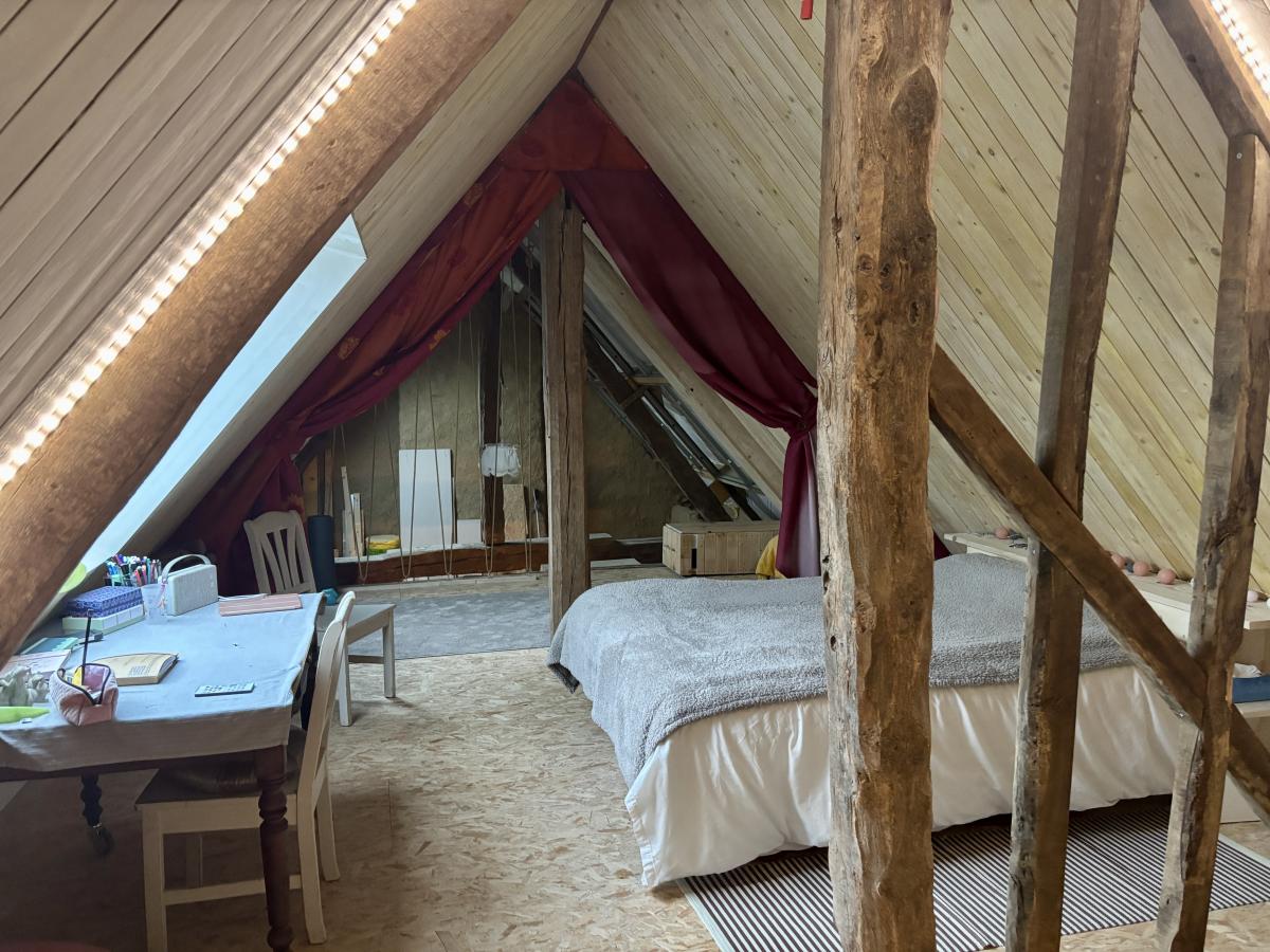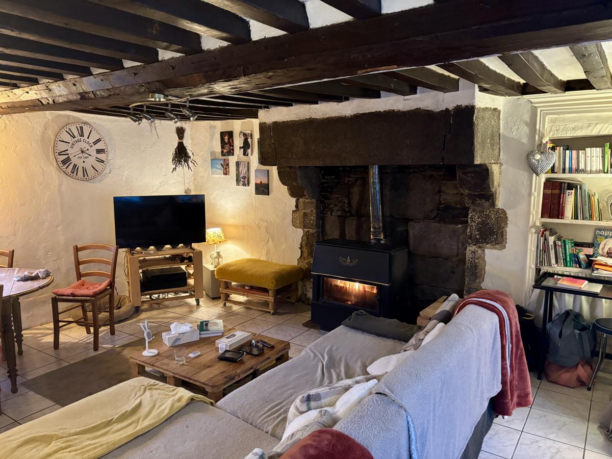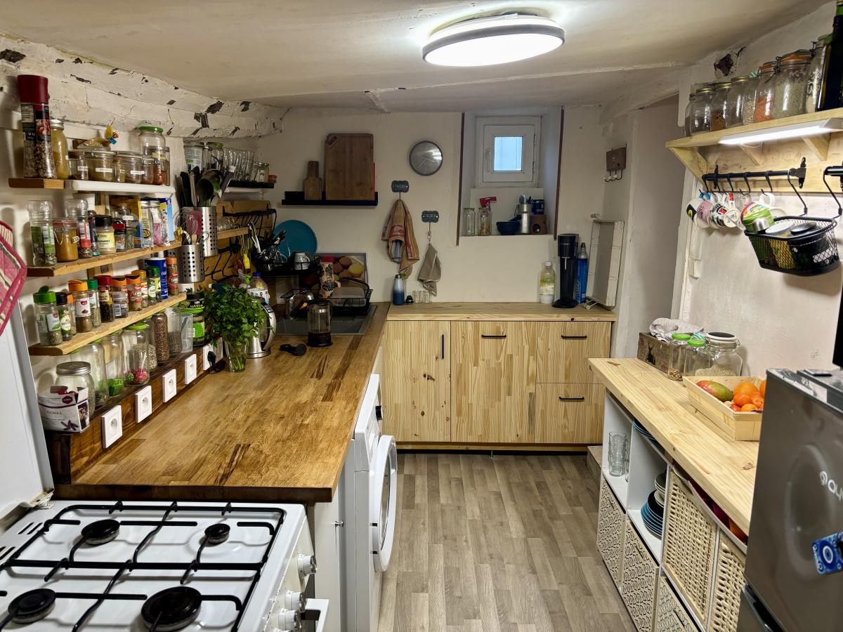 - Au rez-de-chaussée : séjour avec poêle à bois, cuisine aménagée et équipée et cave