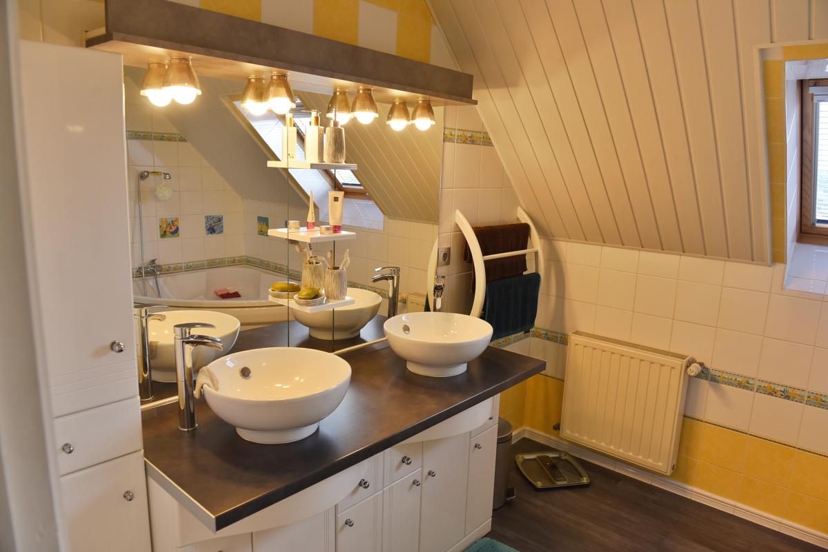 - Grande salle de bains avec baignoire, douche et meuble double vasque, WC.