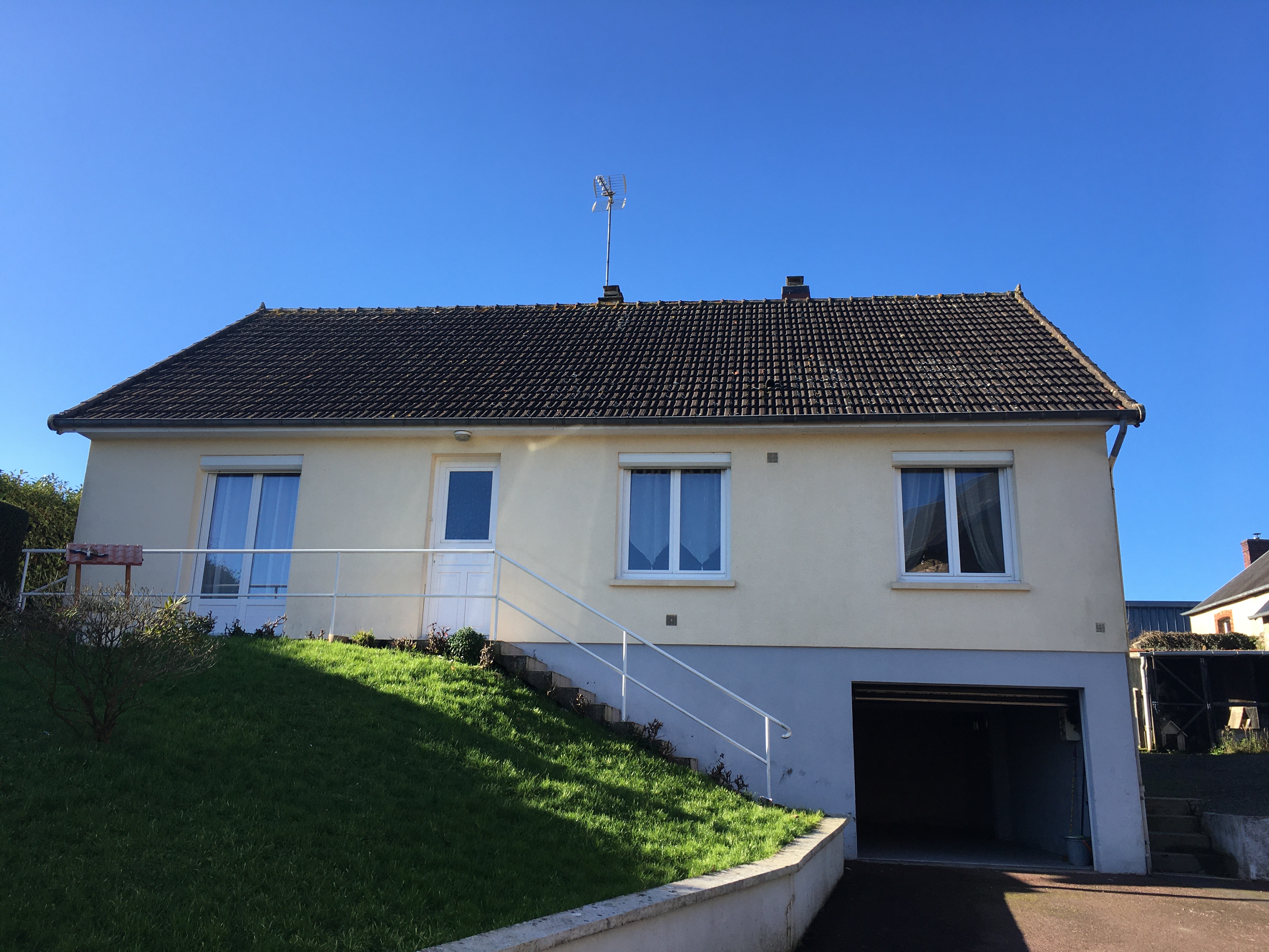 Une maison avec rez-de-chaussée surélevé an. 1972 de 99 m² loi carrez composée de entrée, cuisine avec cheminée, séjour, salle de bains, quatre chambres, débarras, grenier. Sous-sol. Jardin de 619 m². Chauff. aérothermie Px honor. inclus 5,79% (190.000€ NV + 11.000 € HN) ch. acq.
