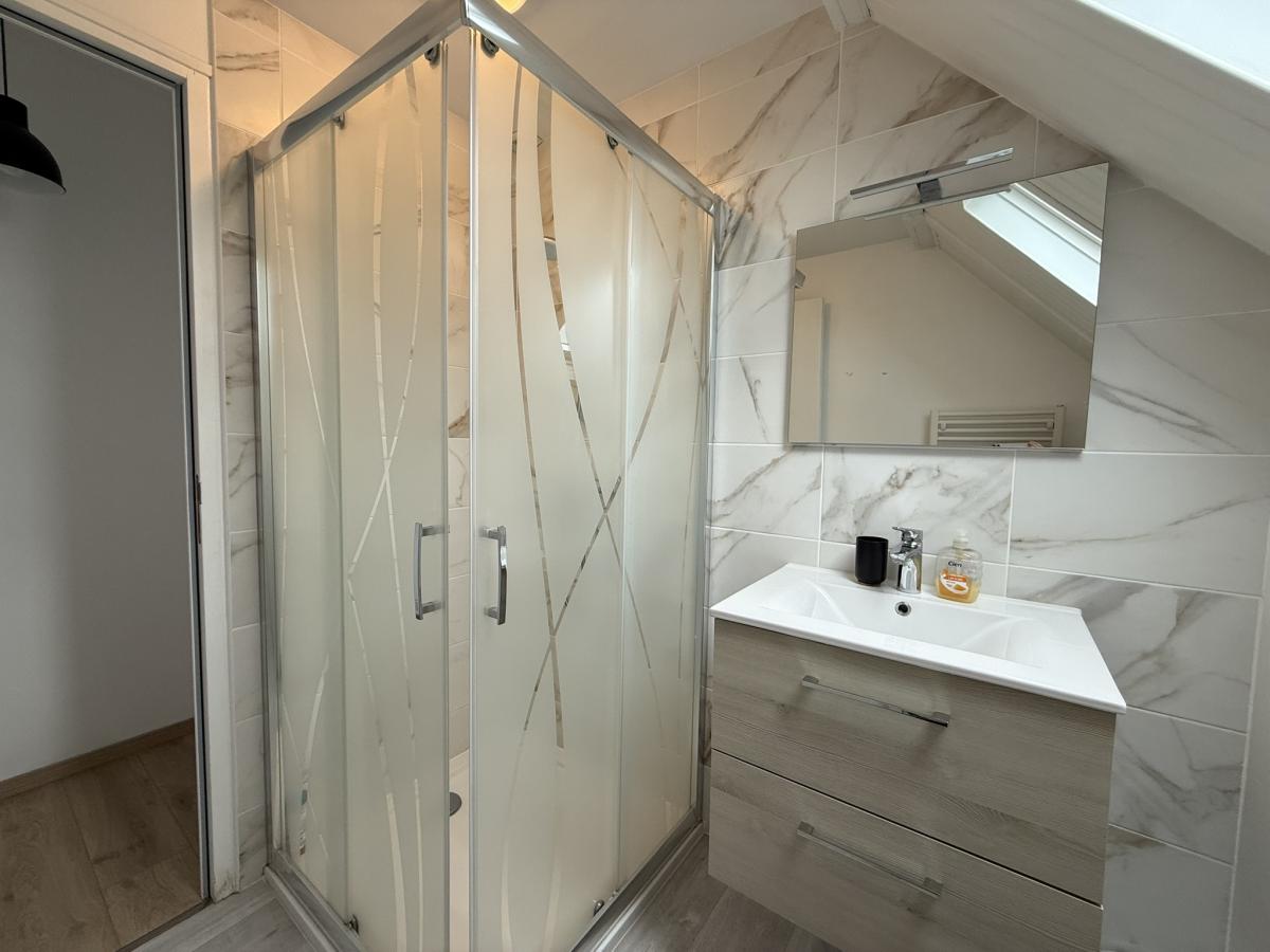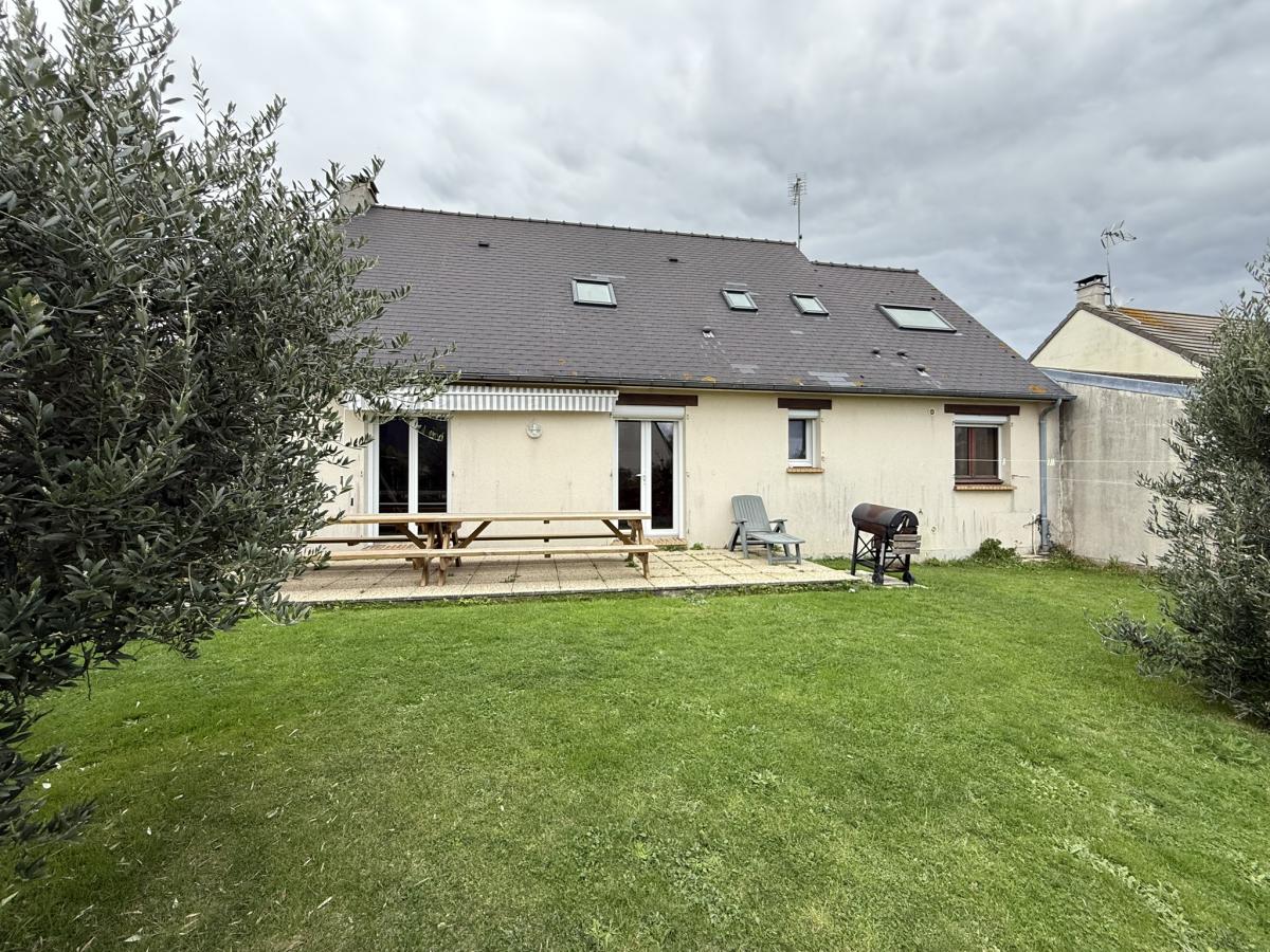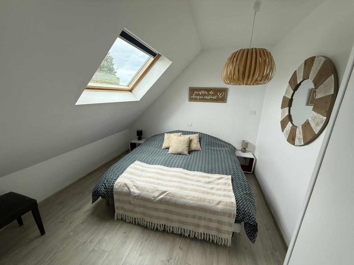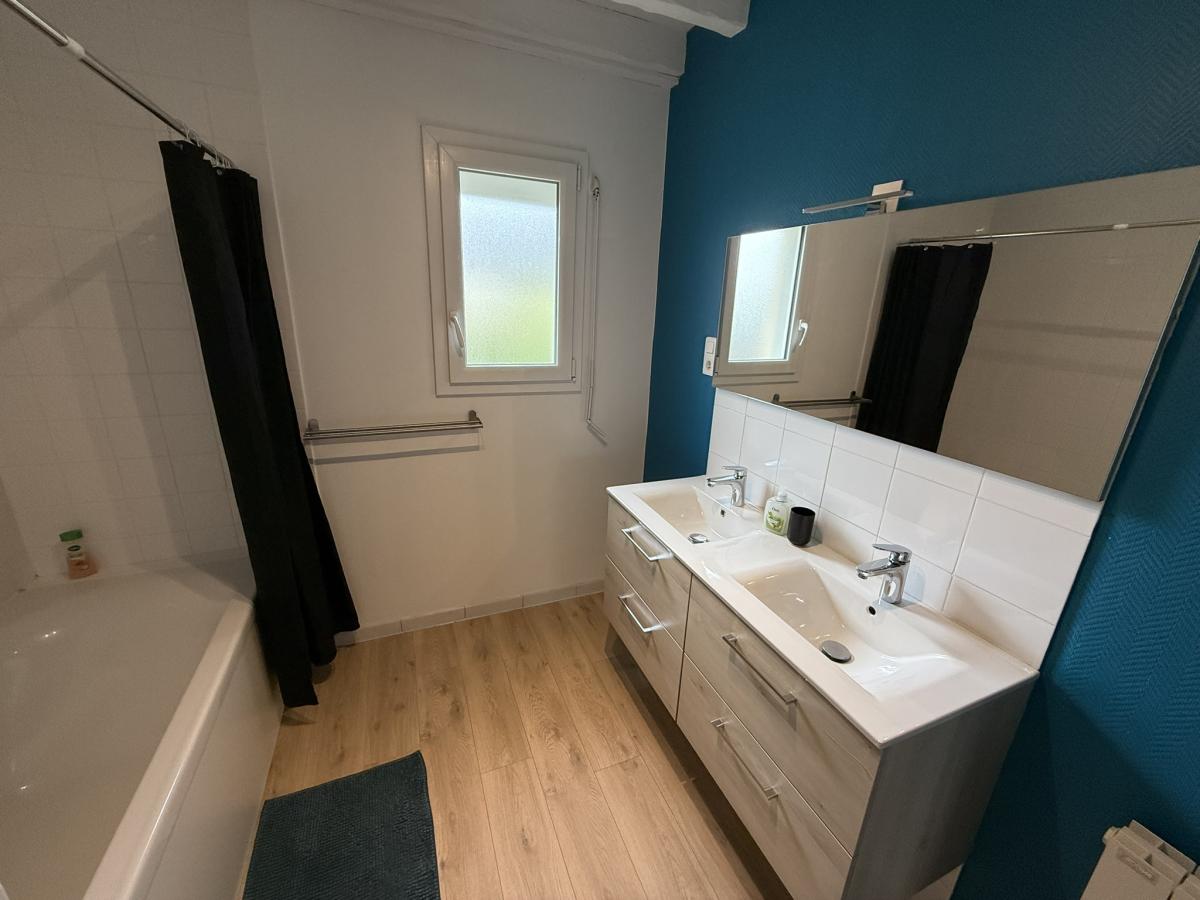 - Au rez de chaussée: entrée, grand séjour avec poêle à bois et cuisine ouverte équipée, une chambre, salle de bains, WC, garage.