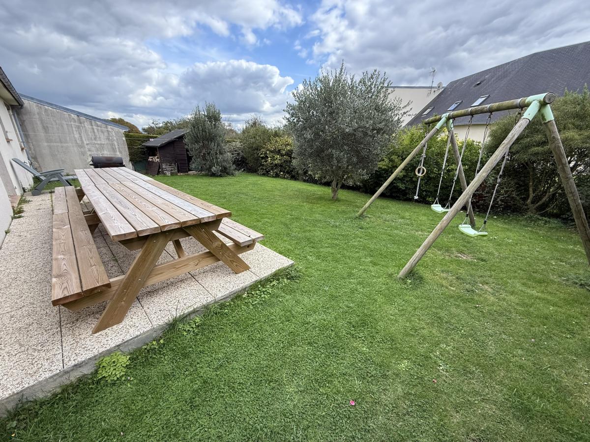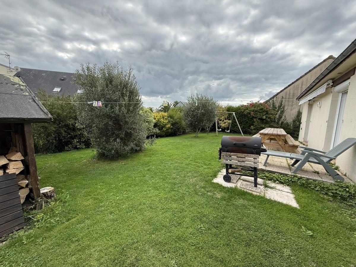Jardin sur trois côtés avec parking bitumé, terrasse et cabanon.