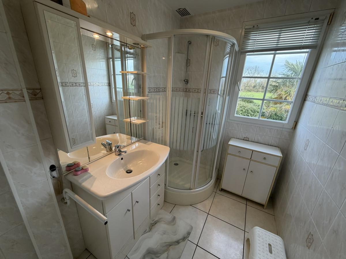 - Au rez de chaussée surélevé: grand séjour avec cheminée, cuisine équipée, salle d'eau, WC, deux chambres dont une avec placard et lavabo, troisième petite chambre.