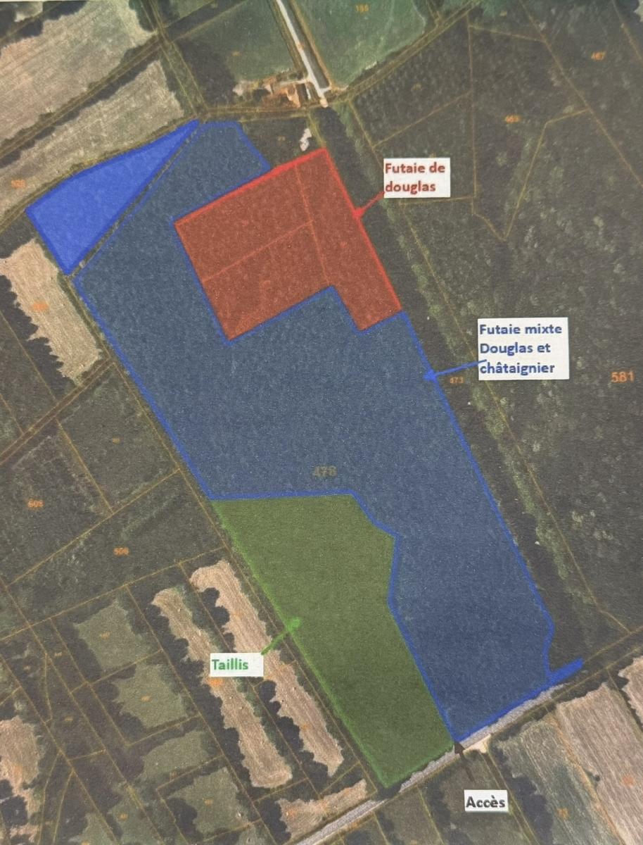 NEGREVILLE, à 6 km de VALOGNES, accès direct depuis la route Départementale 62, bois en nature de futaie de douglas, de châtaignier et de taillis, le tout pour 13 hectares 63 ares 28 centiares.