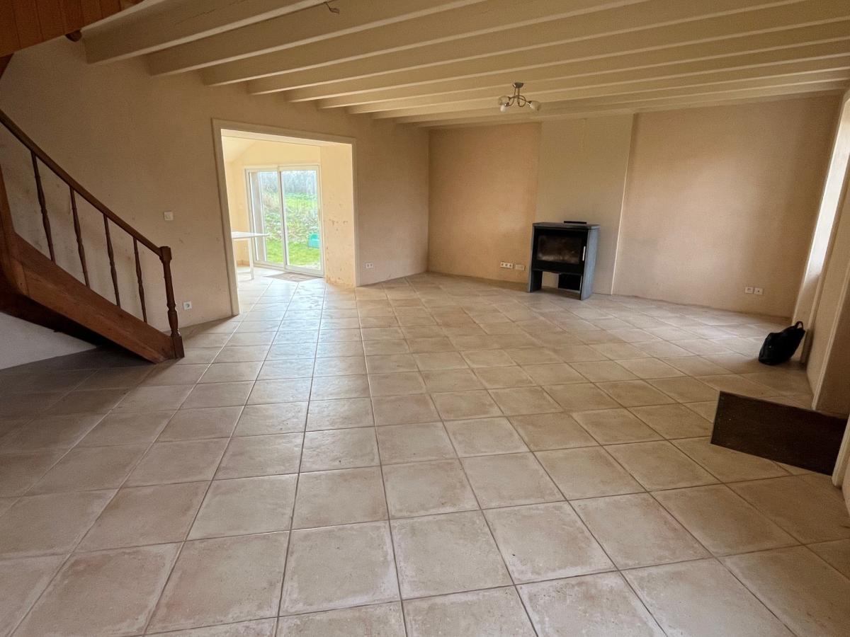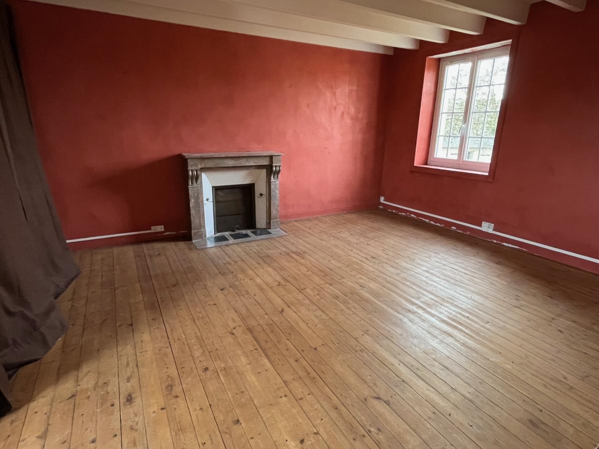 Séjour avec poêle à bois 45 m² et départ d'escalier bois, cuisine (à installer) 16 m², arrière cuisine / buanderie 10 m², salon avec cheminée insert et autre départ d'escalier bois 20 m², une chambre avec salle de douches attenante et wc,