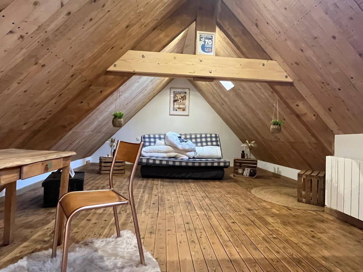 Séjour avec cuisine ouverte équipée (éléments hauts et bas, plaque de cuisson, hotte, four, réfrigérateur) avec poêle à granulés 30 m², dégagement (coin bureau) wc, buanderie,