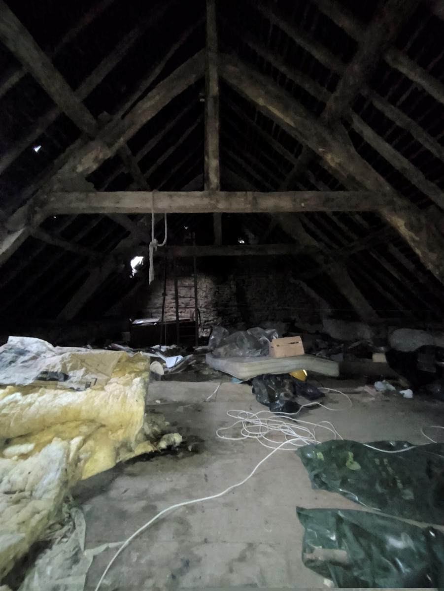 Le rez-de-chaussée est composé d'un séjour-cuisine avec poêle à fioul, une pièce, une chambre.