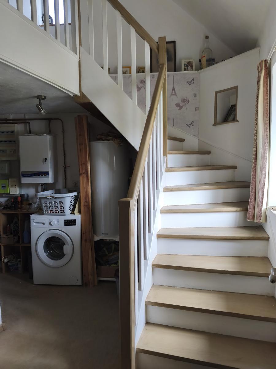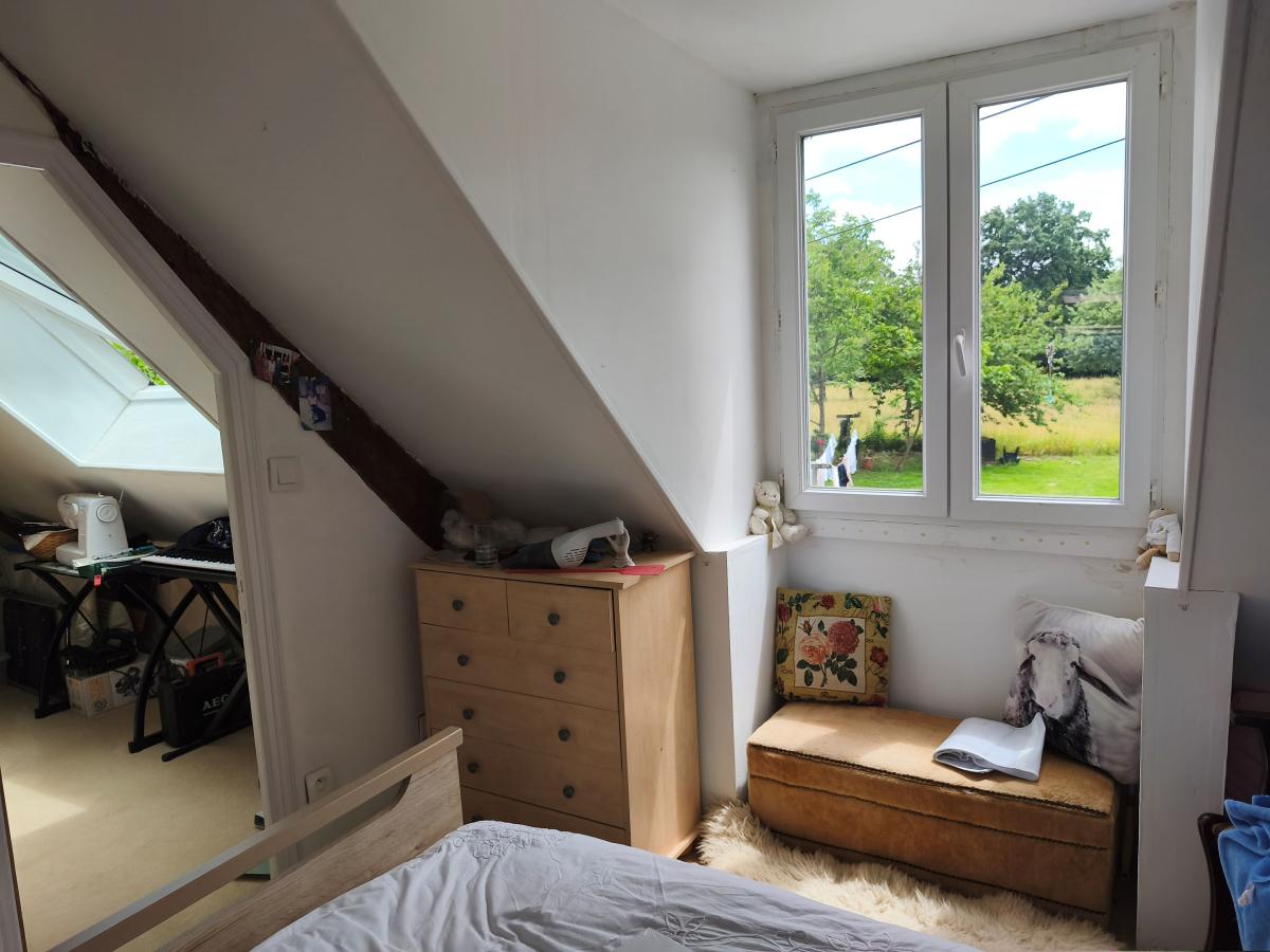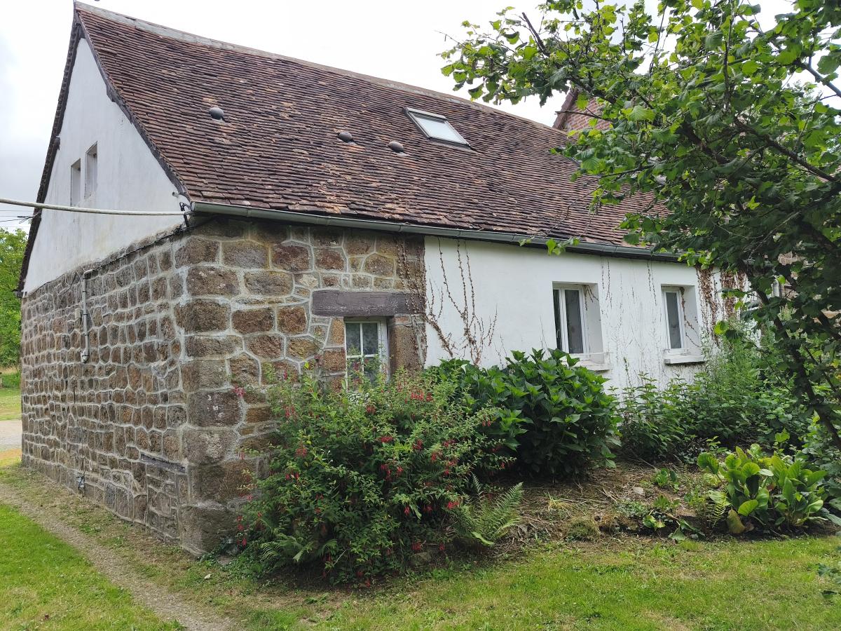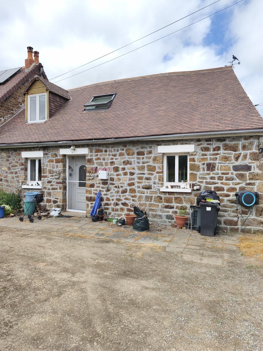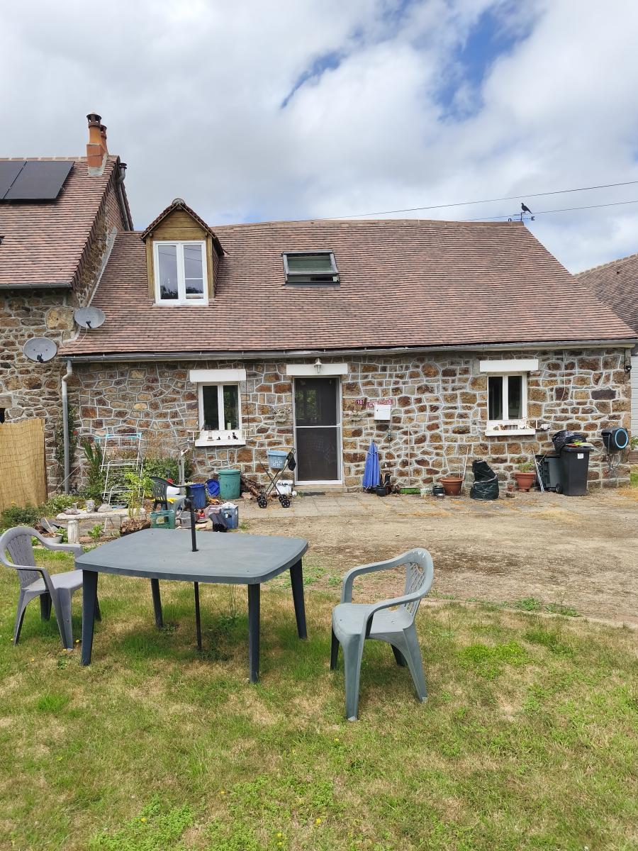 Dans hameau en campagne, maison de 4 pièces (55 m²) sur env. 700 m² de terrain. Le rez-de-chaussée comprend un séjour avec cuisine aménagée et insert, salle d'eau, wc, buanderie, Le 1er étage comprend 3 pièces dont une à usage de chambre. Cour et jardin, l'ensemble sur 700 m² de terrain environ. Chauffage central électrique. DPE : F.