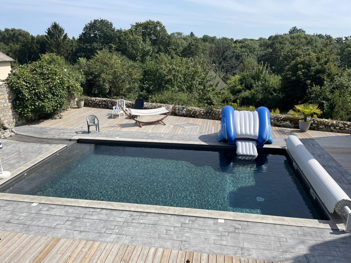 Vue panoramique sur le terrain et sur la nature depuis la terrasse arrière sur pilotis, le tout sur 1400 m² . Piscine naturelle chauffée (5m x 9m), eau drainée par des plantes, sans chlore, avec rideau de sécurité.
