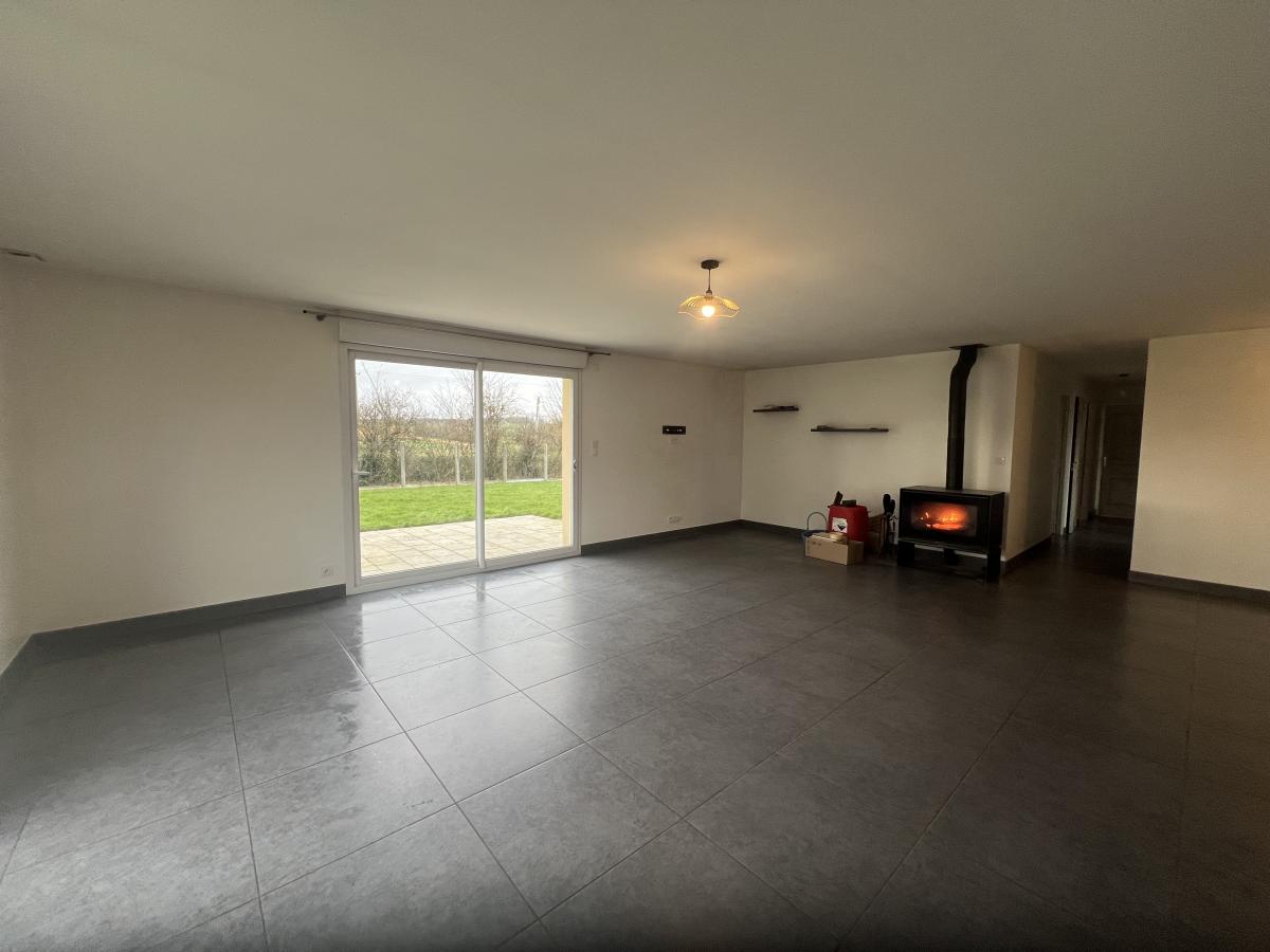 Belle pièce de séjour de 61 m² avec grandes baies vitrées (cuisine équipée, séjour et salon avec poêle à bois), 3 chambres, salle d'eau, WC, buanderie.