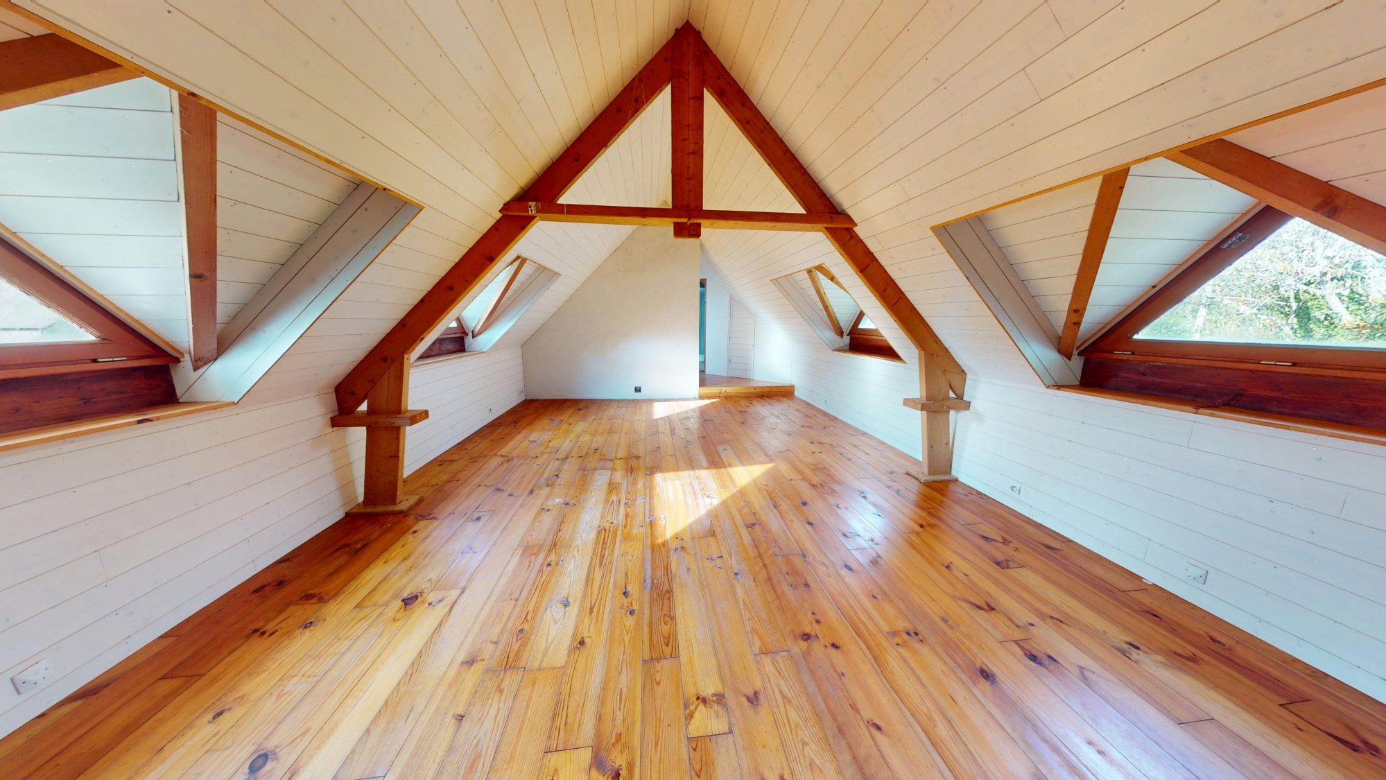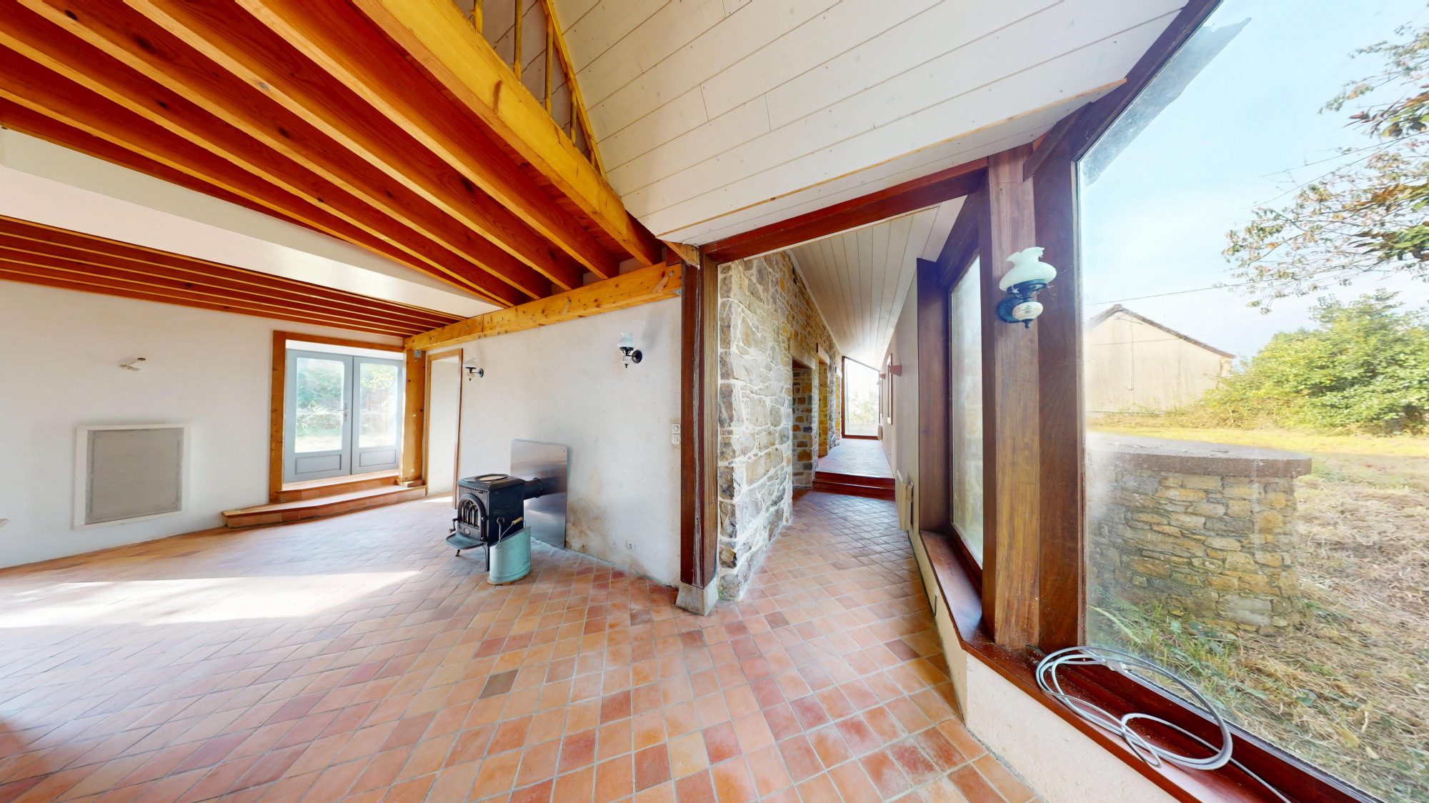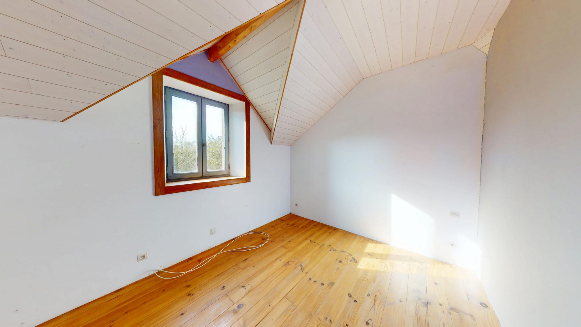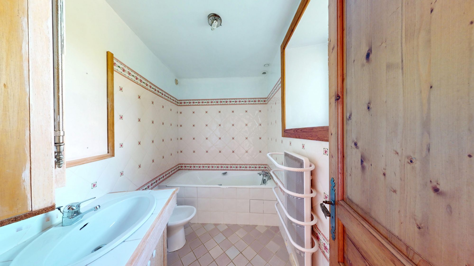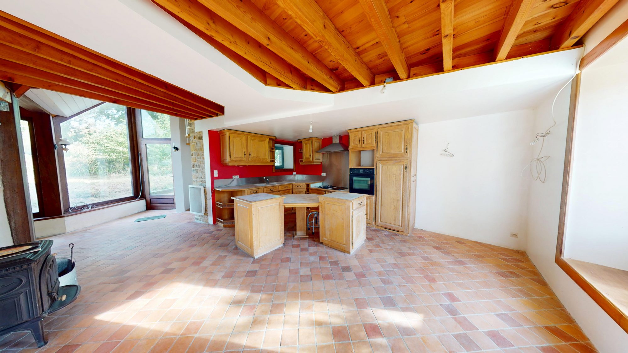 - au rez-de-chaussée : cuisine avec poêle à bois, buanderie, WC avec lavabo, deux chambres dont une avec cheminée insert, salle de bains ;